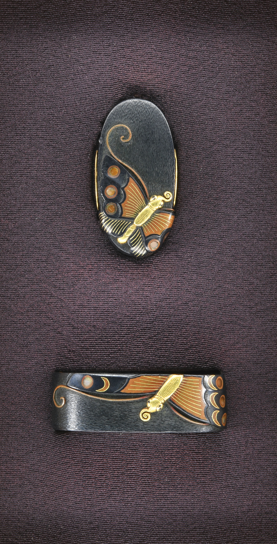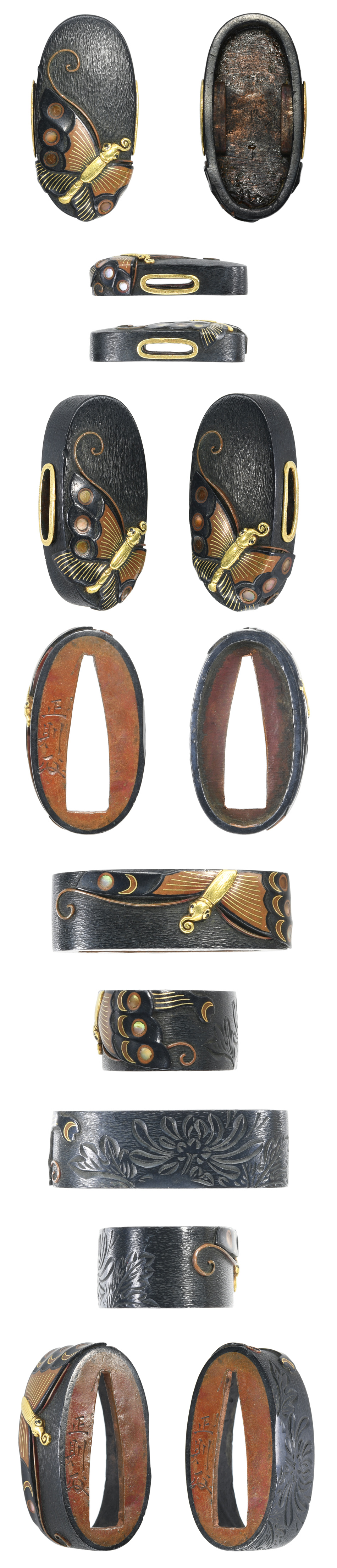 赤銅縮緬石目地 高彫 象嵌色絵 嵌入