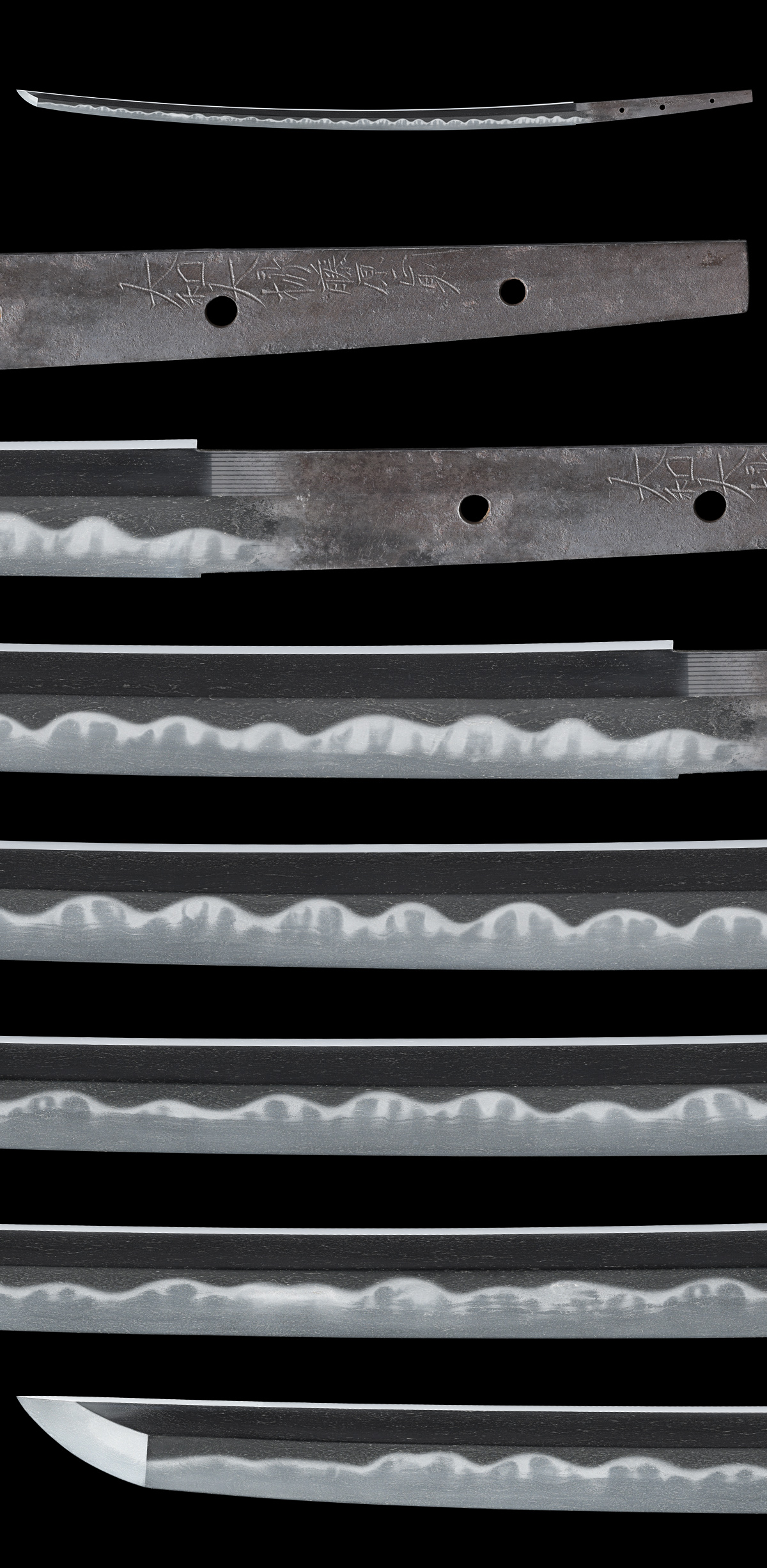 大和大掾正則は、一説に三条吉則の末葉と伝え、本国は丹後国宮津、山城国に住していましたが、後に越前国福井に移住します。江戸時代に入り、越前国が結城秀康六十七万石の城下となると、正則や近江国の下坂康継をはじめとする諸刀工が各地から同国へ移住して越前鍛冶は大いに繁栄しました。本作初代正則は、新刀期の越前鍛冶を代表する刀工で、斬れ味に富み、良業物に列せられます。慶長十三年頃から慶安四年頃に年紀のある作が残ります。本刀は、初代大和大掾正則の一刀で、互の目に尖り刃、丁子を交えた大変勢いのある乱れ刃を呈し、総体肌がよく現れて、野趣に富む出来栄えを示します。