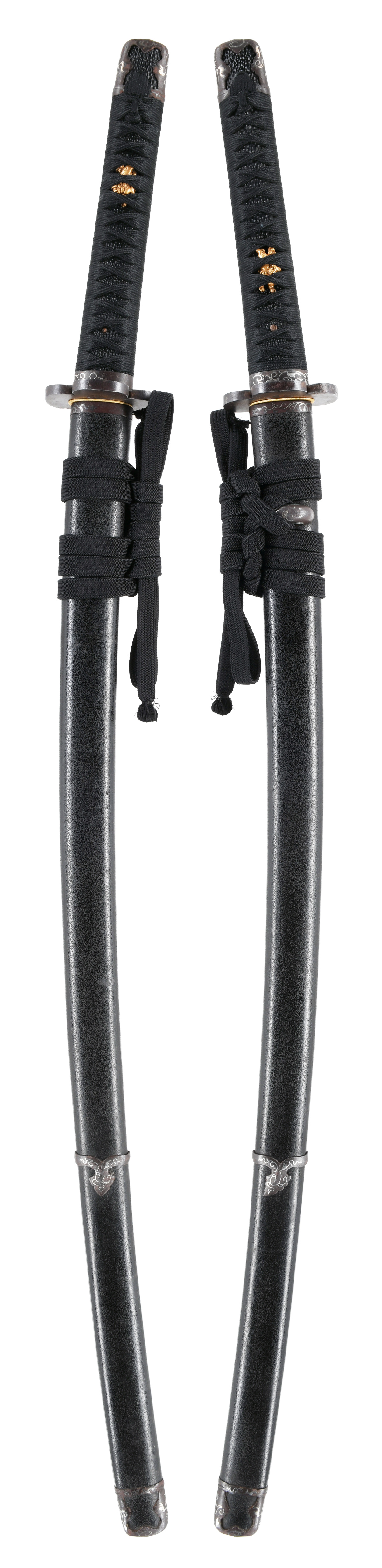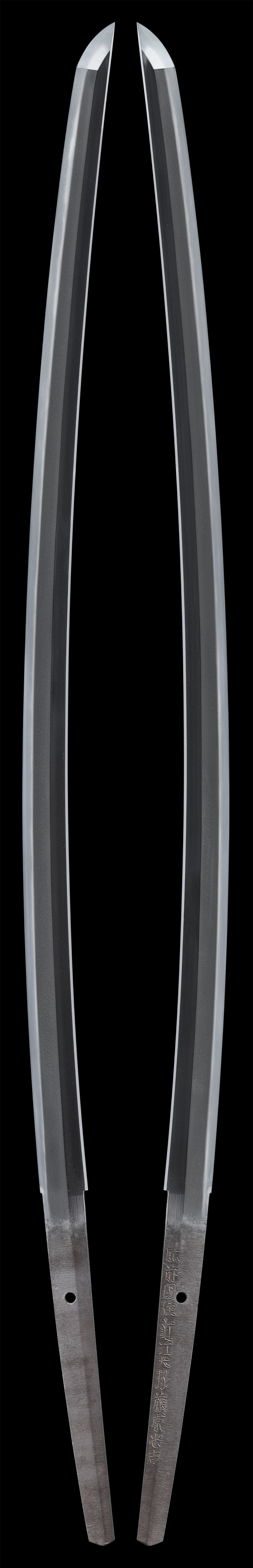 本作は、刃長が二尺三寸一分半、身幅重ね共に尋常、反り適度、鎬筋が凛と立って、中切っ先となる健全な刀姿の一口です。地鉄は小杢目肌に地沸付き、精良で美しい肌合いを示します。刃文は直刃で、刃縁に小沸がふんわりと付き、匂口深く、切っ先まで均一に整った焼刃となります。帽子はそのまま直ぐで先小丸に返ります。茎は生ぶ、切鑢目で、刀工銘を切ります。拵は、鞘が黒石目地塗、揃鉄金具を配した半太刀拵です。本刀は四代忠吉の一作。麗しい肥前肌に明るく冴えた直刃を焼き、肥前刀ならではの魅力を備えた同工の優品としてご紹介いたします。白鞘、金銀着二重はばき、黒石目地塗鞘半太刀拵、特別保存刀剣鑑定書。