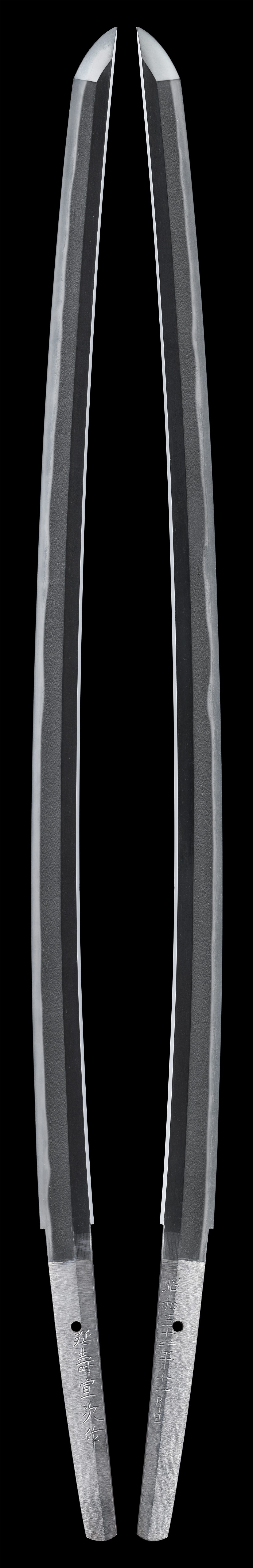 延寿宣次は、本名を谷川博充。昭和二十三年(1948)生まれの熊本県八代郡千丁町を出身とする刀匠です。父 源盛吉(無鑑査刀匠)より鍛刀技法を学び、昭和四十六年(1971)に作刀承認を得ます。刀銘は、父盛吉の前銘である「宣次」を継いで二代宣次を名乗ります。新作名刀展において受賞歴多数、清磨写しの名手である父との合作も残るなど、父盛吉と並び実力派の刀工でありましたが、平成十年(1998)に他界されています。作柄は相州伝、古延寿、筑前左文字に範をとって作刀されていました。