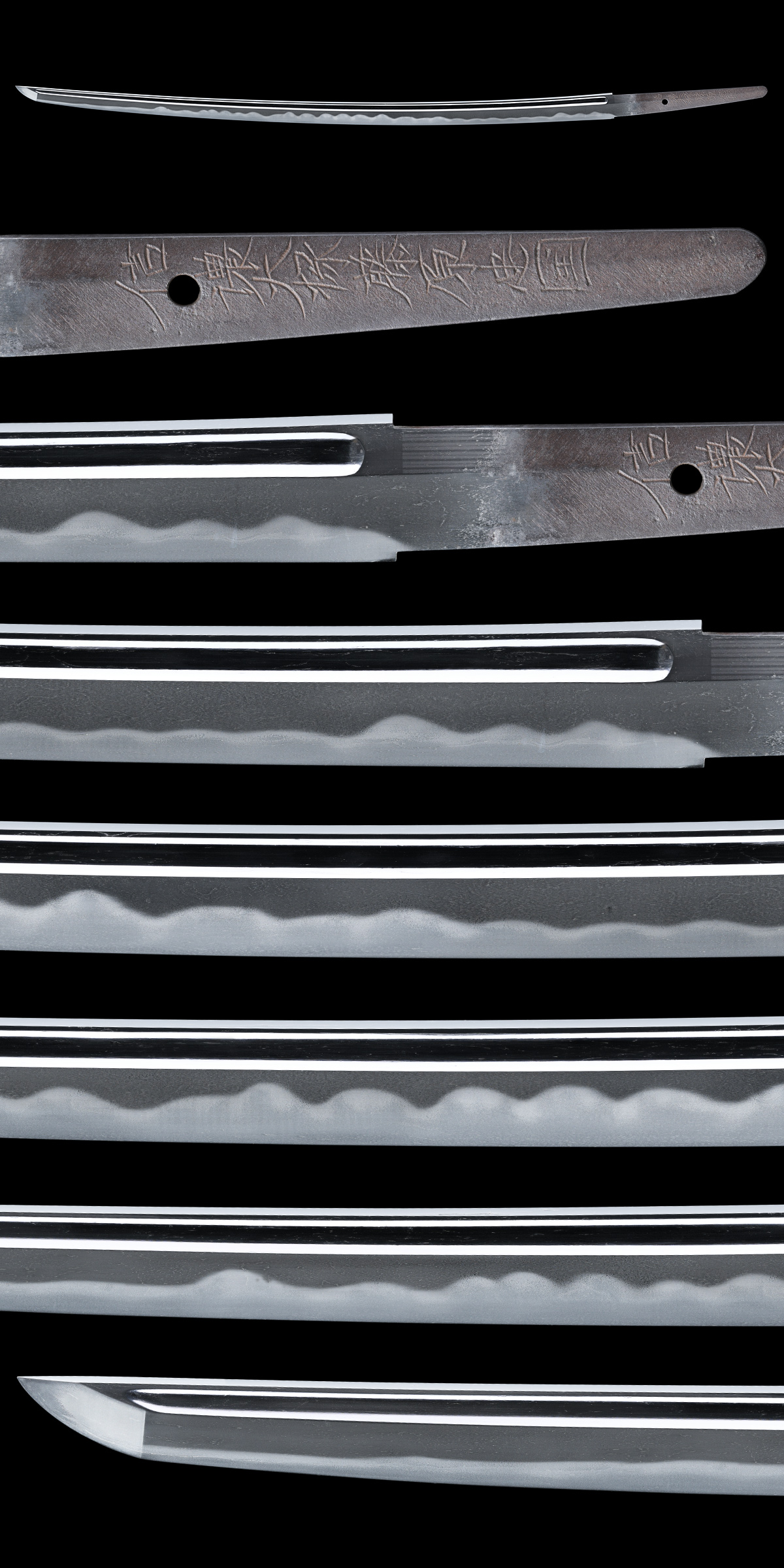 初代信濃大掾忠国は、江戸初期 寛永頃の刀工で、山本八郎太夫と云います。生国山城国(京都府)で、同地の出羽大掾国路門人です。初期に国勝、刻国と銘を切り、後に因幡国(鳥取県)へ移って、忠国と改めました。同国鳥取藩池田家に抱えられ、御用鍛冶として槌を振るいました。寛永十一年(1634)信濃大掾を受領。寛文六年(1666)に没します。他に「平安城住藤原刻国」、「平安城住忠国」、「信濃大掾藤原忠国於因州鳥取作之」、「山本信濃守忠国造之」などと銘を切ります。初代信濃大掾忠國の御刀。勢い溢れる焼刃が特徴の優刀としてご紹介いたします。