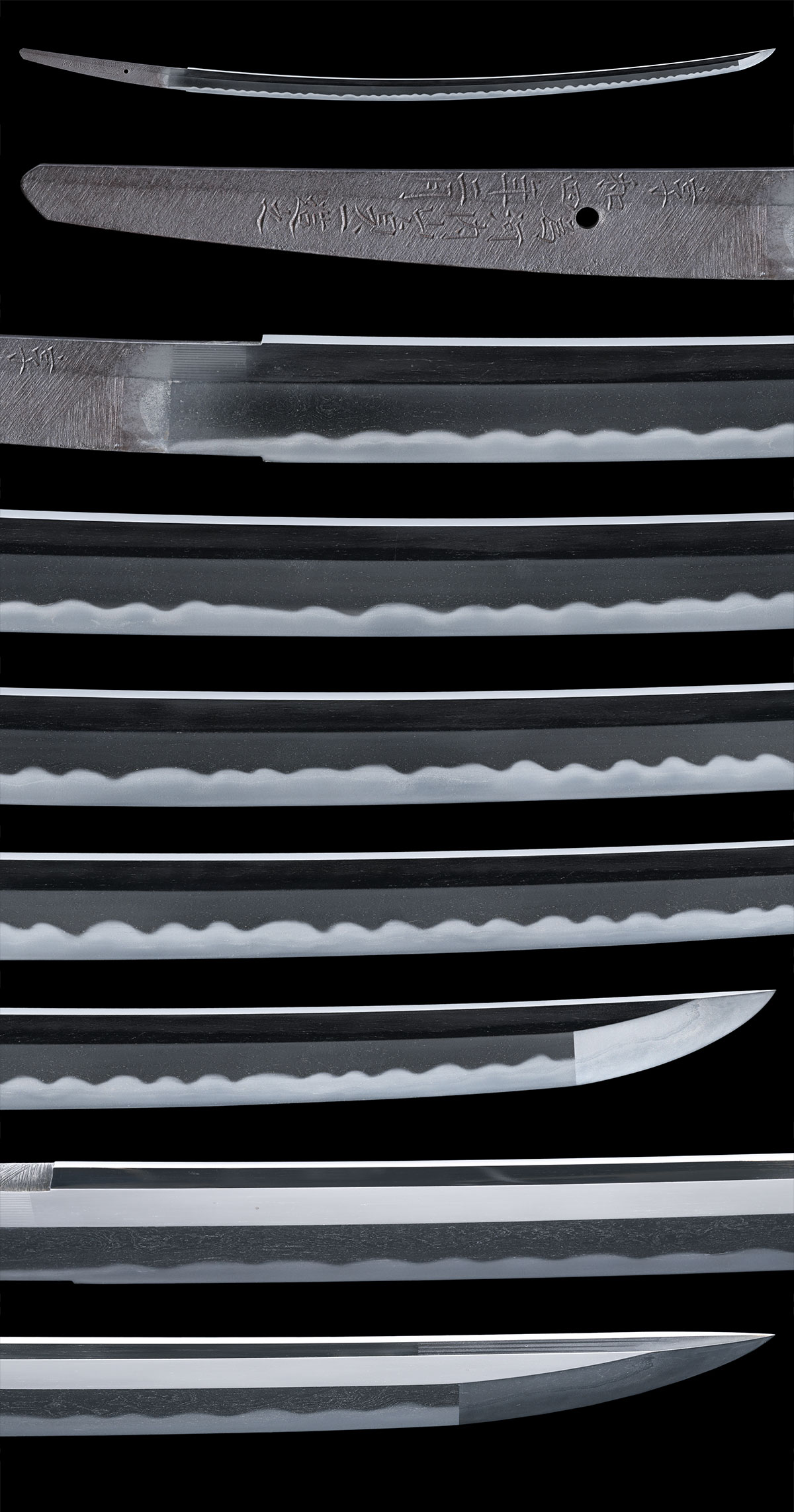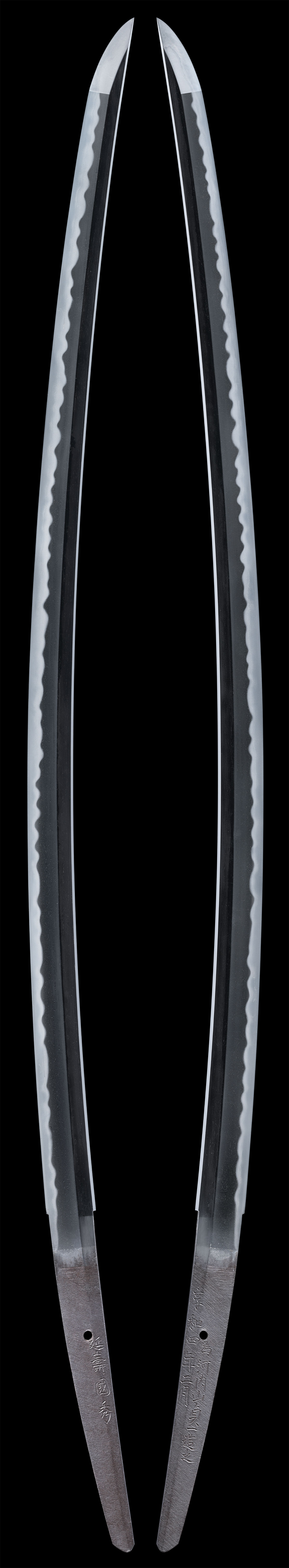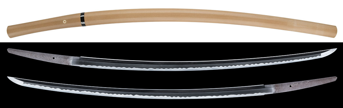 本刀は注文打ちの堂々たる一口です。体配は、刃長が二尺五寸五分弱と長寸で、身幅は尋常、重ね厚く、反り深い、中切っ先が大きく延びた、鋭く豪壮な刀姿です。地鉄は良く練られて、総体に肌がよく表れます。板目肌に杢目交じり、刃寄りは流れ心の柾風となります。刃文は小沸本位の互の目乱れで、焼頭が揃い乱れます。処々、地中の働きが刃中に入り、金線、砂流しとなって盛んに働きます。帽子は、乱れ込み先小丸へ返ります。茎は生ぶで、丁寧な化粧鑢がかかり、刀工銘と年紀、注文銘が刻されます。古刀期より連綿と続いた延寿一派の末尾を飾る同工の上出来の一口です。地鉄は肌がよく表れて、総体見所に富んだ優刀としてご紹介致します。白鞘、金着せ一重はばき。特別保存刀剣鑑定書。