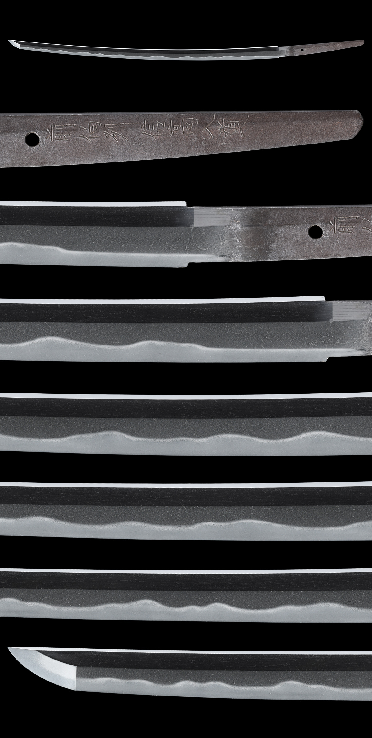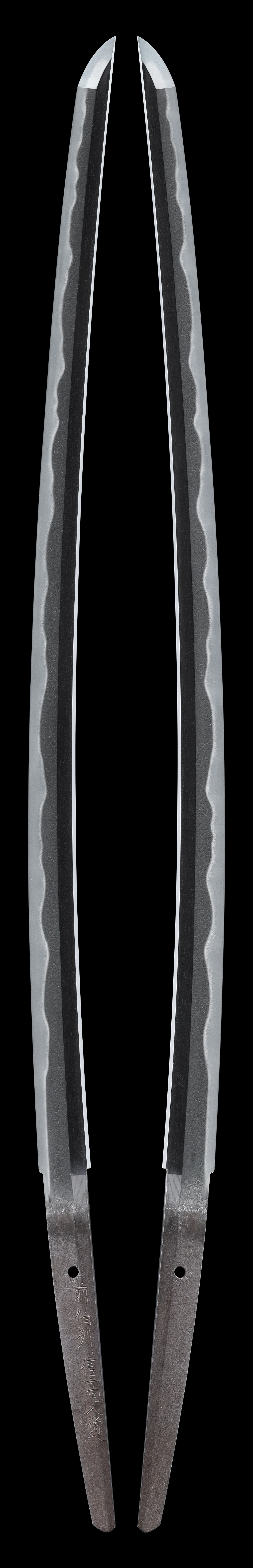 本作体配は、刃長が二尺三寸三分弱。身幅広く元先で幅差付き、反り適度で中切っ先となる寛文姿の一口。鍛は、小杢目肌に処々流れ肌が交じって、地沸よく付き、細かく地景が入り、整った綺麗な肌合いです。焼刃は直ぐで焼き出し、小さな互の目や丁子が連れて、一つの山の様になり、尖り刃や矢筈刃風、湾れを交えて穏やかで上品な乱れが構成されます。帽子は直ぐで先小丸に返ります。茎は生ぶ、筋違鑢目で、刀工銘が切られます。本刀は、尾張新刀の名手 二代伯耆守信高の一口です。湾れに互の目を交えた刃文は、山並みを遠望するかのような景色に見え、味わい深い趣を纏います。白鞘、金着二重はばき、特別保存刀剣鑑定書。