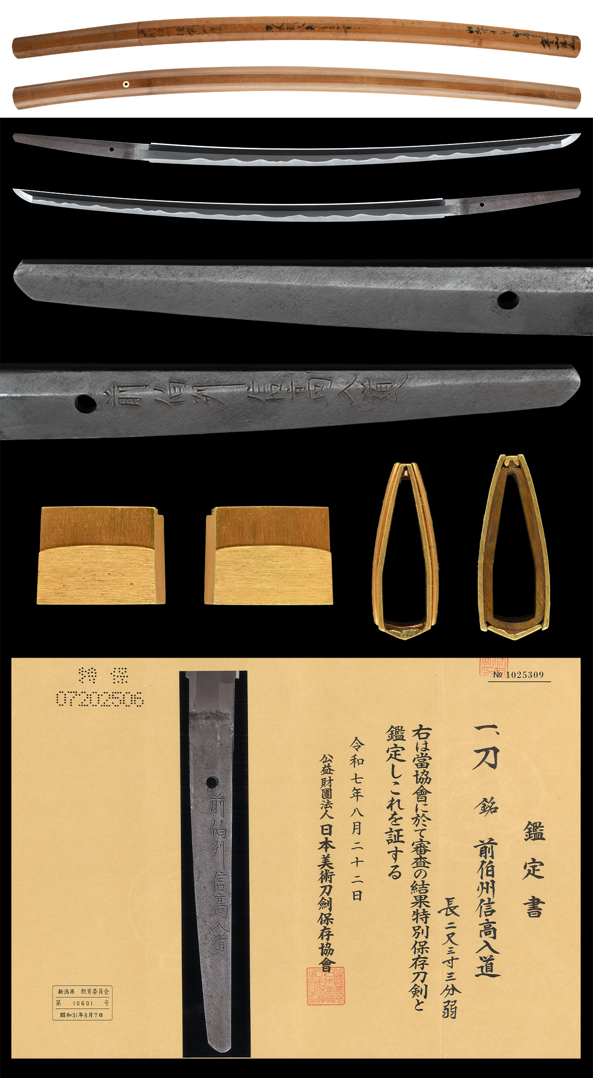 伯耆守信高。慶長のはじめ、初代信高が美濃より尾張清洲城下に移り、名古屋城が完成した慶長十五年頃、名古屋に移住します。初代信高の刻銘と技術は二代信高に受け継がれ、その後も代々尾張徳川家の藩工として栄え、六代まで続きます。本作は二代目である前伯州信高入道の作品です。俗名は河村伯耆。寛永十年に伯耆守を受領、寛文二年、六十歳にて隠居し、前伯州山月居士と名乗って、閉遊入道と称します。元禄二年没、行年八十七歳。伯耆守信高、前伯州信高入道、前伯州山月信高居士、伯耆守藤原信高閉遊入道などと銘を切ります。同一派は初代から五代までが「伯耆守」を受領している尾張刀工の名門であります。