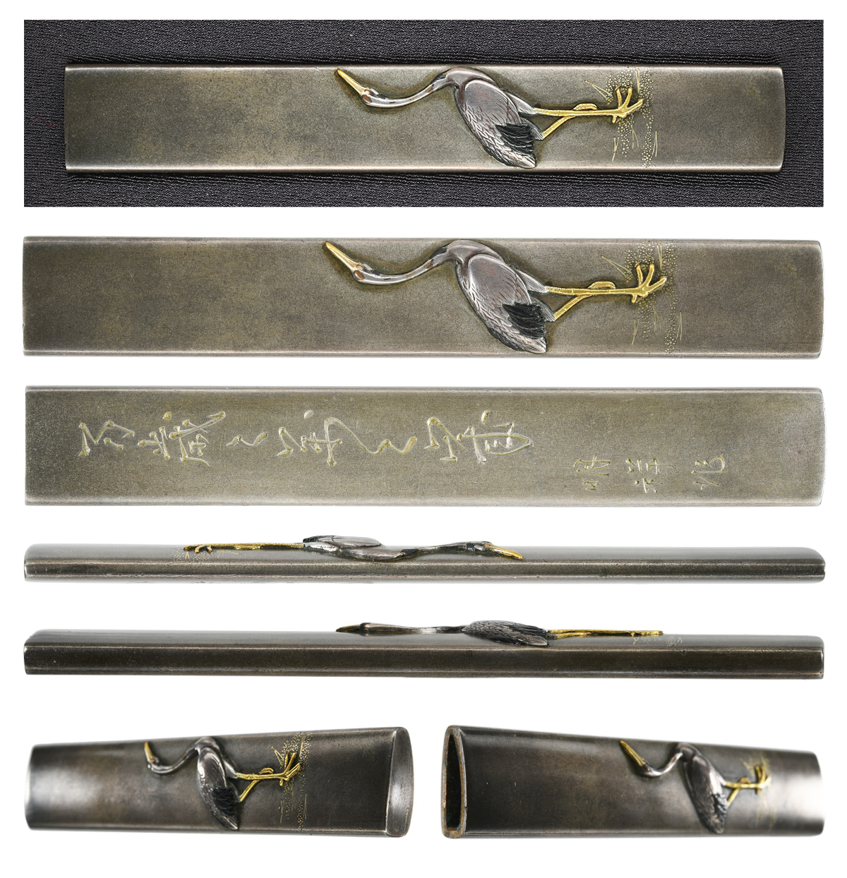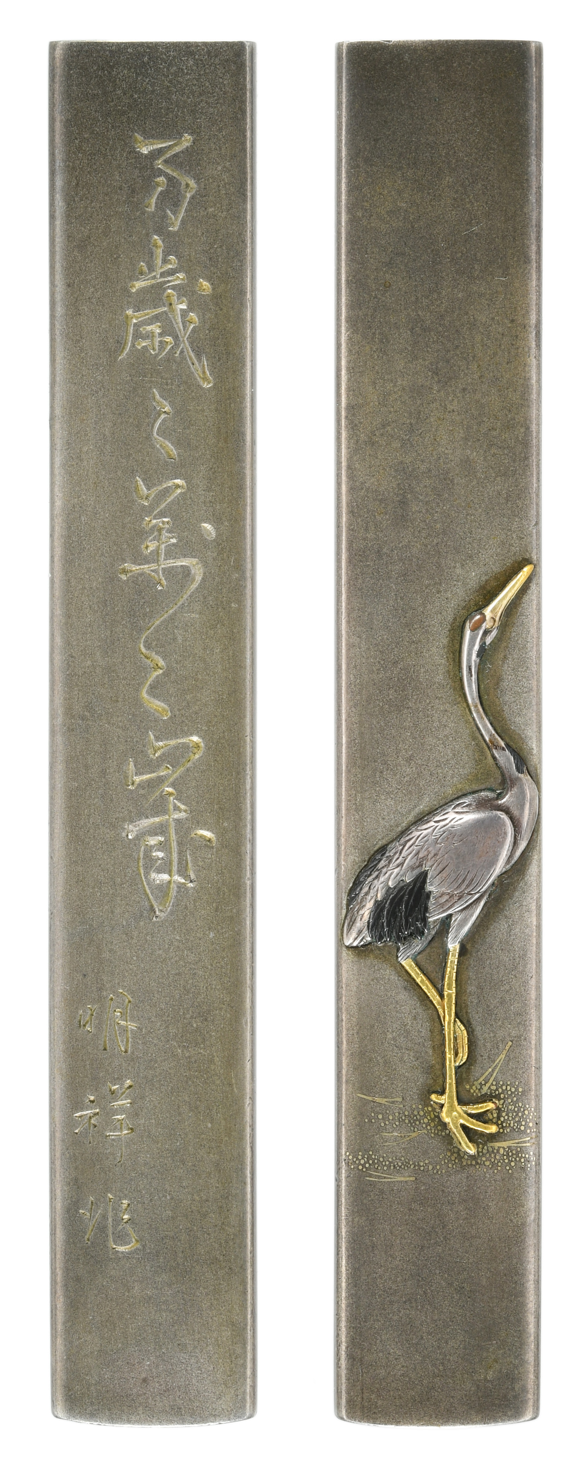 丹頂鶴図小柄 朧銀磨地 高彫 据紋象嵌色絵 裏甲鋤彫「万歳〱万々歳」