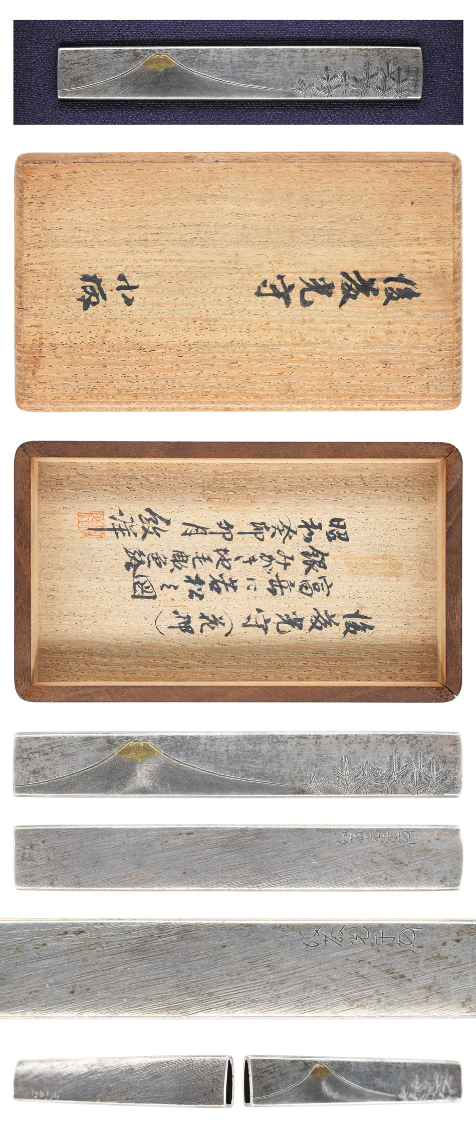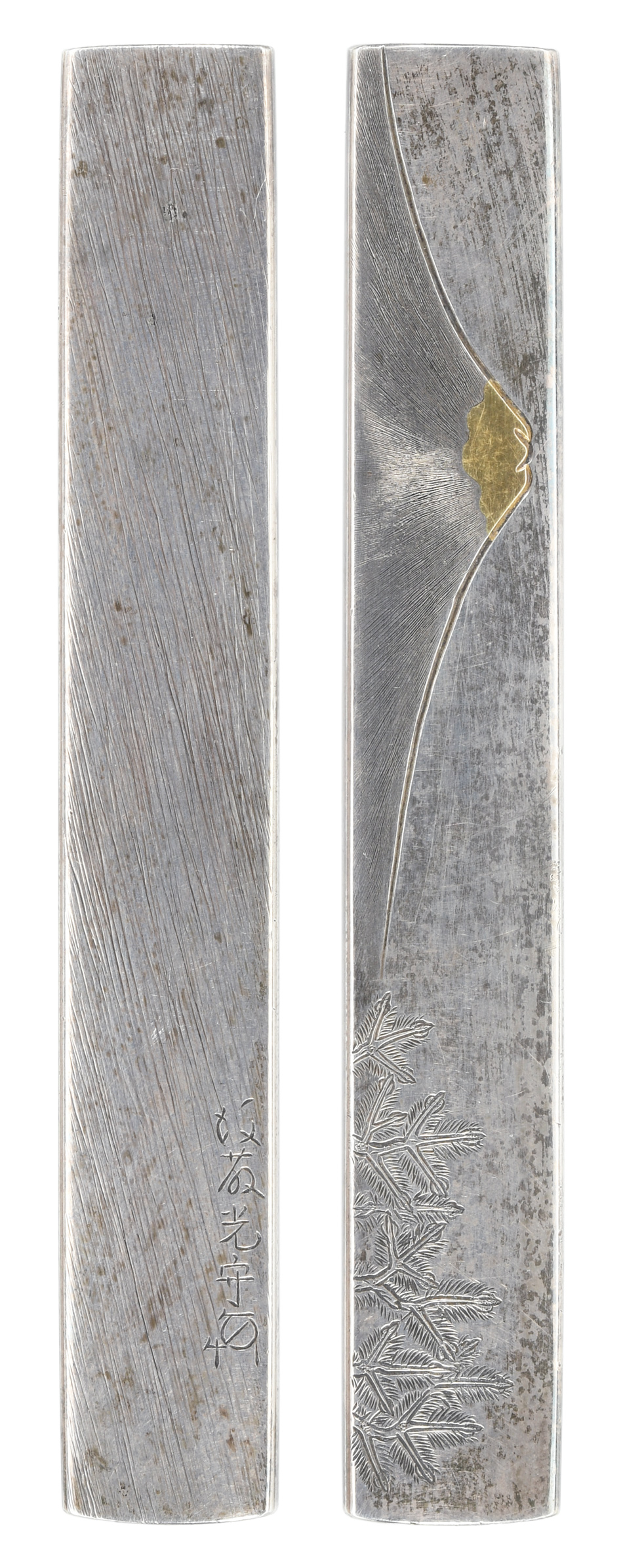 富嶽若松図小柄 銀無垢磨地 毛彫 象嵌