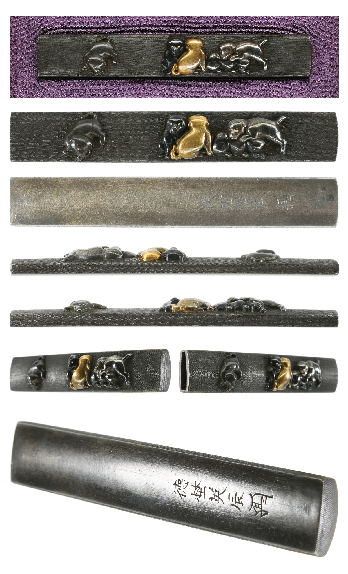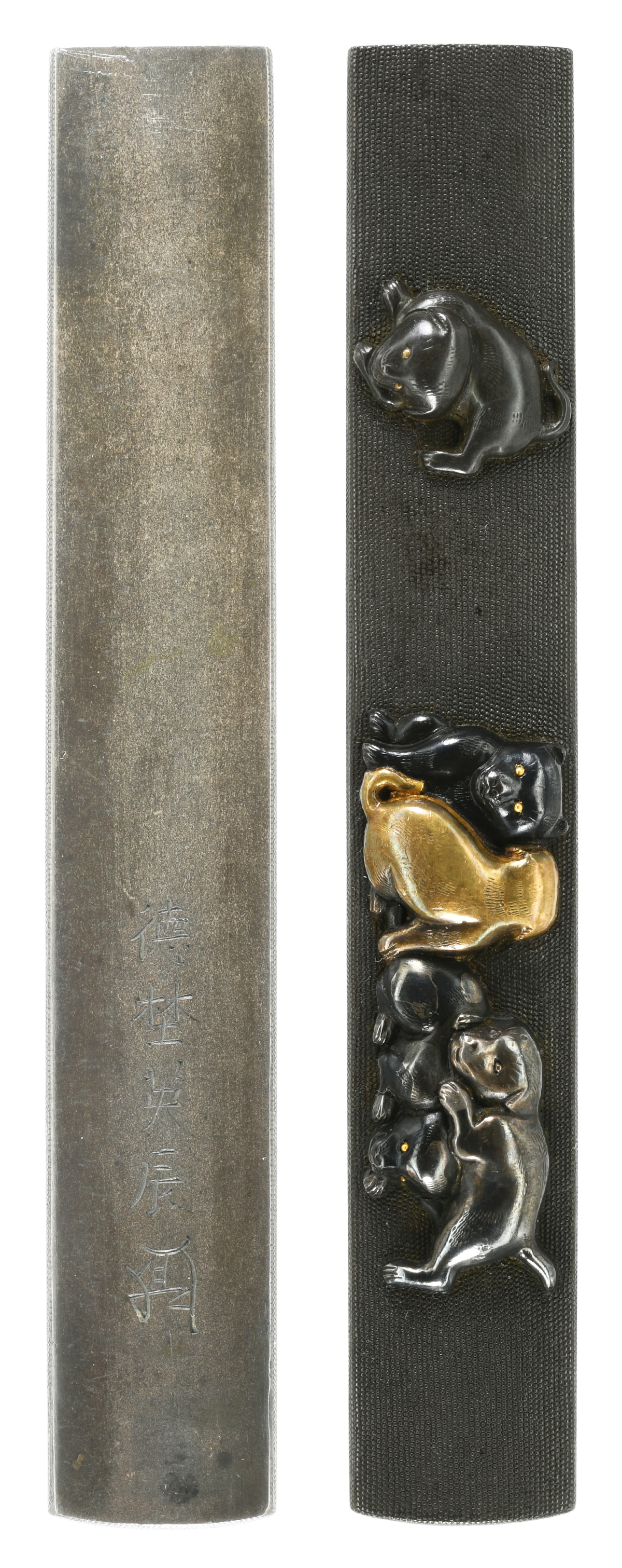 狗児図小柄 四分一魚子地 高彫 据紋象嵌 色絵