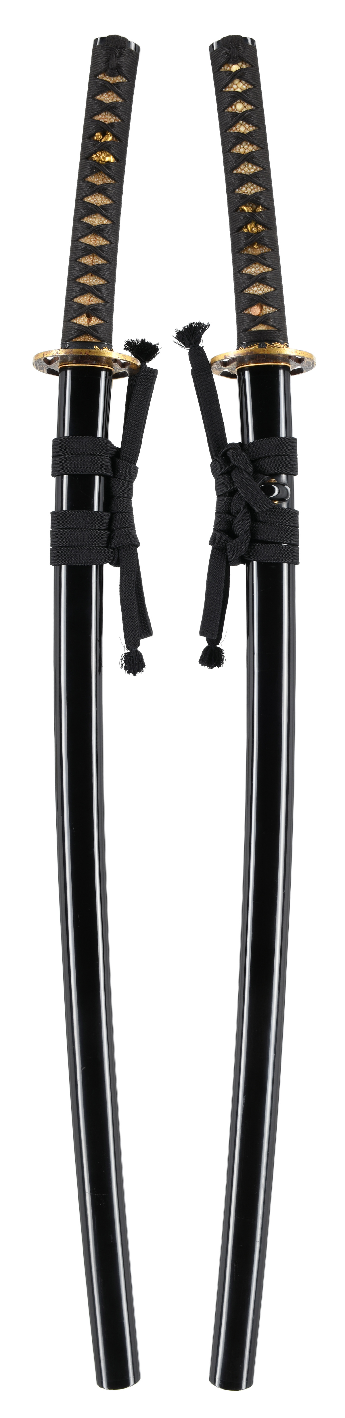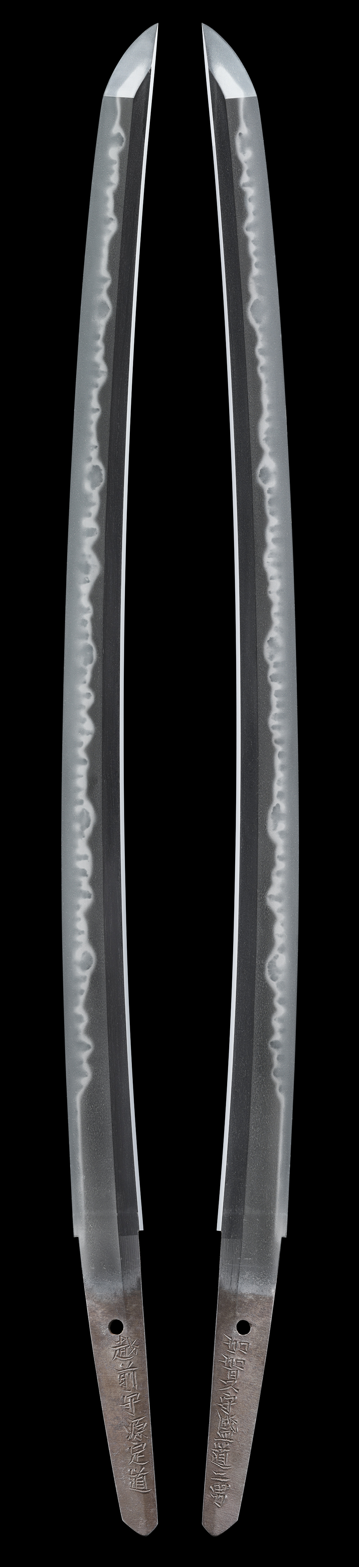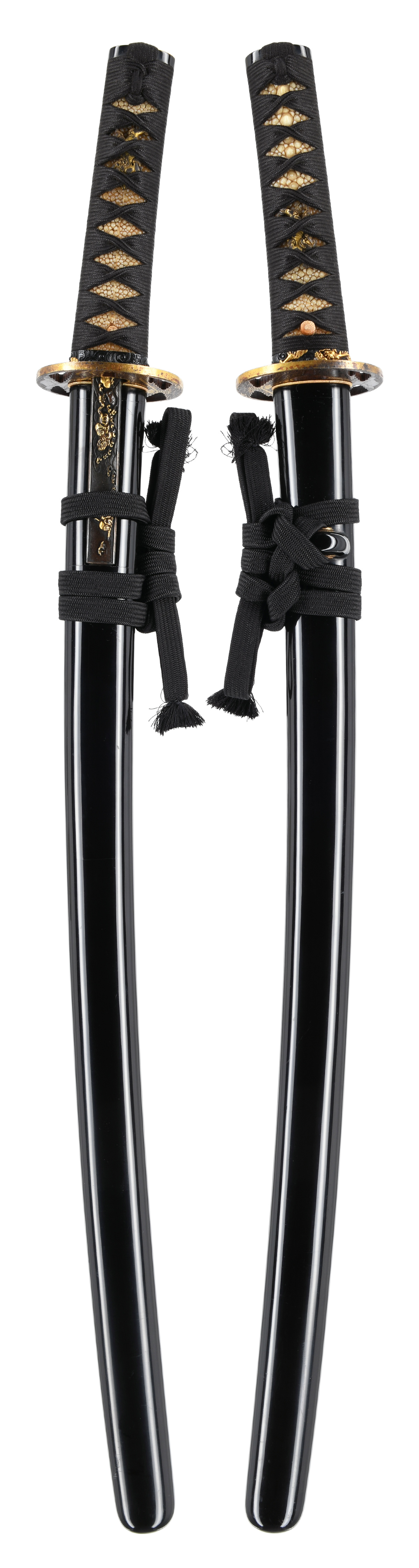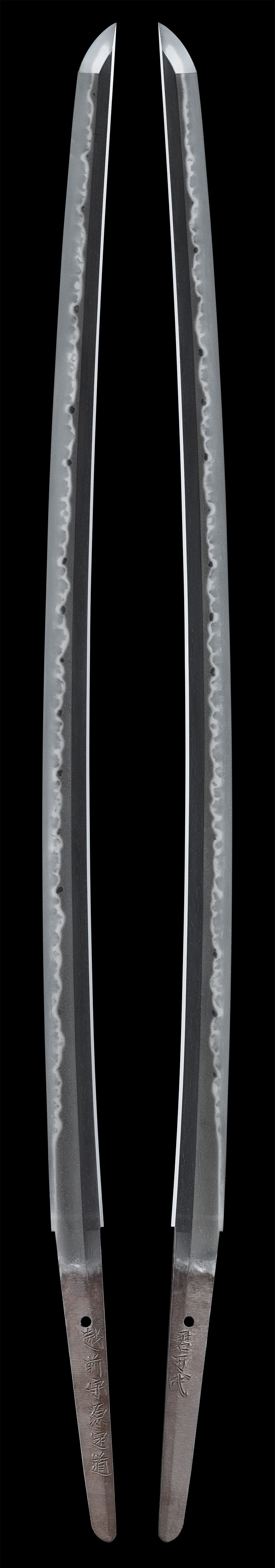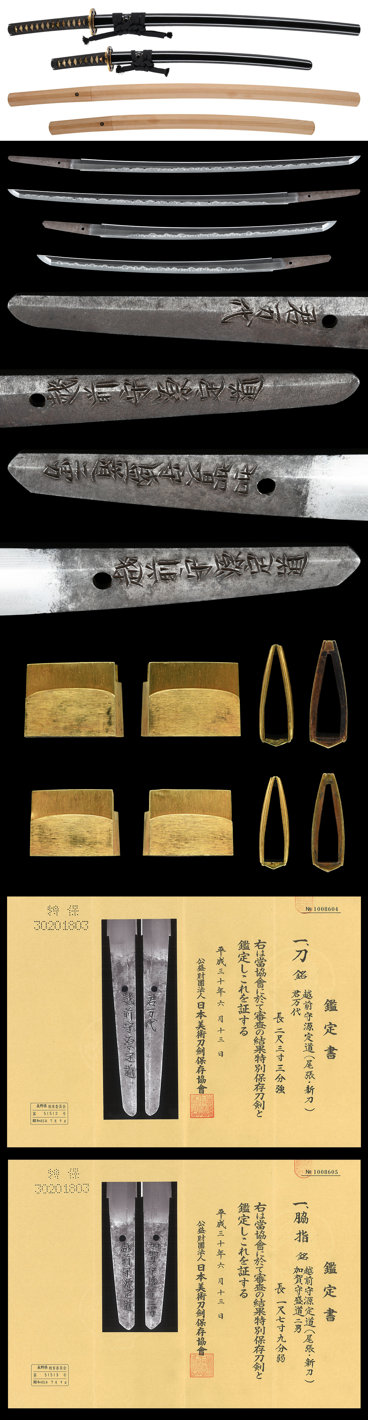 本品は、定道の大小揃えの御品となります。刃長は、刀が二尺三寸三分強、脇差が一尺七寸九分弱。両刀共に身幅元先で確りとした気品のある刀姿であります。地鉄はどちらも良く詰んだ板目鍛で、地沸を厚く微塵に敷いた精強な地肌を示します。長刀の刃文は、直ぐで焼き出し、互の目を基調に丁子、尖り刃、矢筈刃風等を交えて、処々飛び焼きが掛かります。小刀は、直ぐで焼き出し、丁子乱れを主として、袋丁子や尖り刃が交じります。両刀どちらも変化に富んだ動きのある刃が構成され、刃縁に沸がよく付いて爛々と冴えます。刀は帽子が直ぐで先小丸、脇差は、浅く湾れて先小丸に返ります。どちらも茎は生ぶ、勝手下がり鑢目で、勢いのある鏨使いで銘が切られ、保存状態が良く、鏨枕が立ちます。生まれは美濃国関、名古屋に住して活躍した越前守源定道の大小一対の優品。両刀共に力強い出来口を呈し、刀に切られた「君万代」から、長い繁栄・幸福の願いを込めた入念作である事が伺えます。白鞘、金着二重はばき、黒蝋色塗鞘大小拵、特別保存刀剣鑑定書。