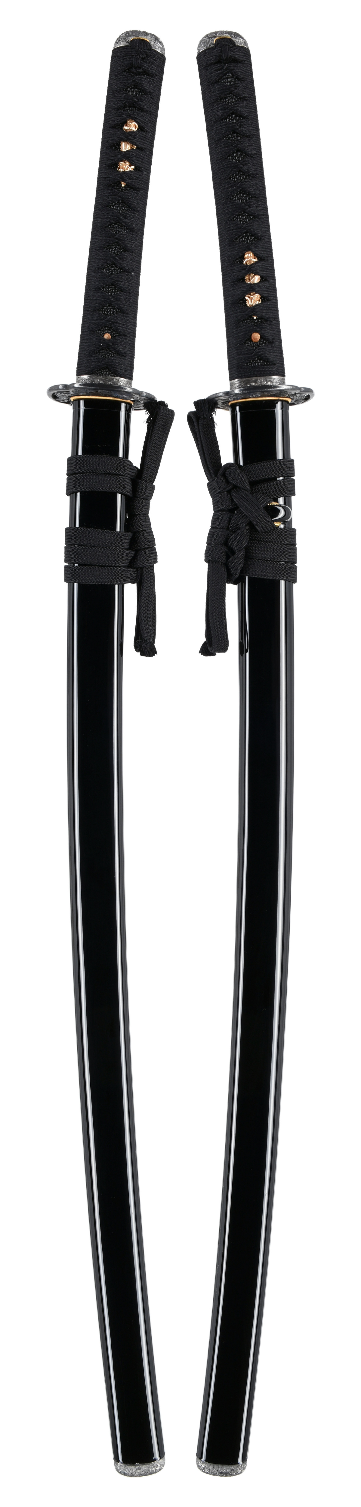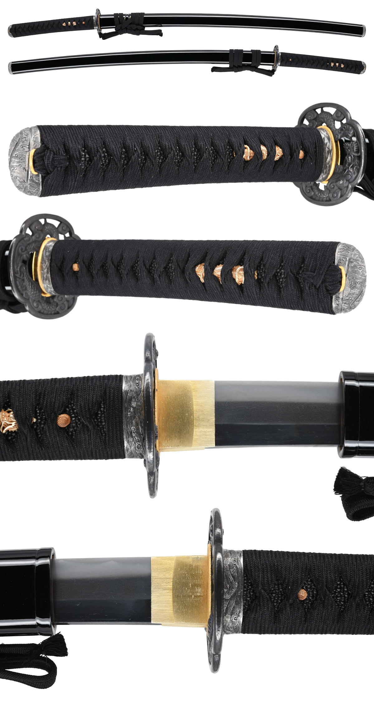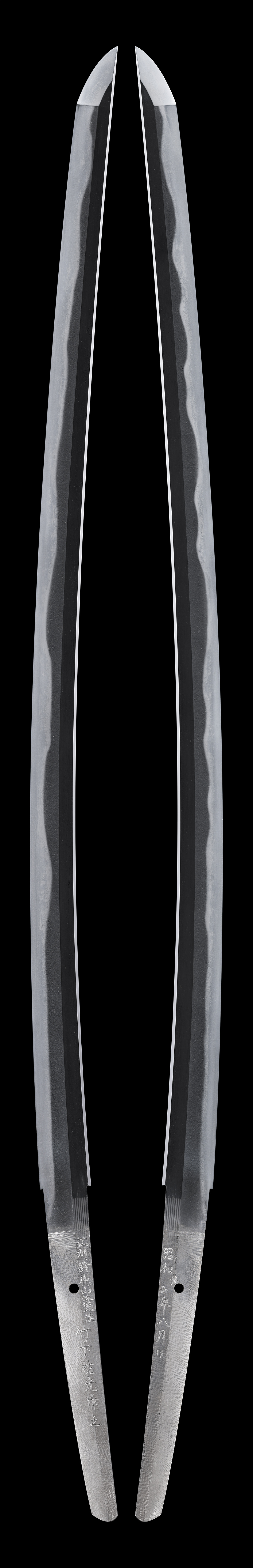 本作体配は、刃長が二尺四寸七分と長さ十分。身幅重ね共に確りとした立派な刀姿を呈します。鍛は、板目肌が良く練れて詰み、杢目交じり、処々流れごころに地沸微塵に付き、地景が入り、総体仕立てよく精緻な地鉄です。刃文は、湾れを基調に互の目、丁子交じり、金線、金筋、砂流しなど幾重にも掛かって盛んに働きます。刃中に沸匂充満し、匂口明るく冴えます。帽子はそのまま湾れて先尖り心となって返ります。滋賀県出身、陸軍受命刀工、竹下祐光刀匠の御刀。破綻のない綺麗な地肌、焼刃は湾れ刃文に金筋、砂流し等長く掛かって盛んに働き、見応えのある優品であります。金鍍金二重はばき、黒蝋色塗鞘打刀拵。