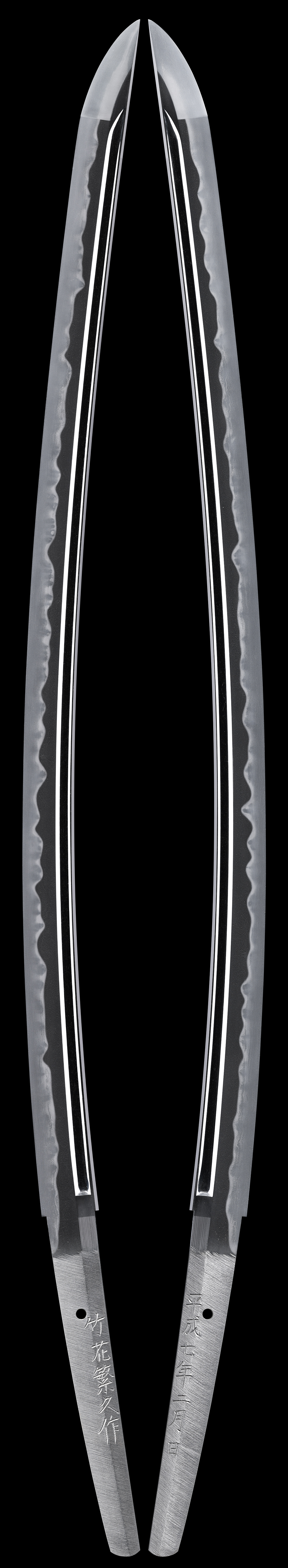 竹花一貫斎繁久刀匠は、昭和二十四年(1949) 埼玉県生まれ。本名竹花久司。昭和四十七年(1972)、東京都板橋区刀匠の酒井一貫斎繁政に師事。昭和五十三年(1978)、文化庁承認。翌年、新作刀展にて初入選して以降、努力賞や優秀賞など、数々の栄誉ある賞を受賞されます。昭和五十八年(1983)、埼玉県比企郡滑川に鍛練所を開設、平成十九年(2007)には、薫山賞を受賞されました。備前長船長義に範をとった大乱れ、相伝備前を最も得意とされ、彫物もお上手でいらっしゃいます。全日本刀匠会元理事。同関東支部長を歴任。