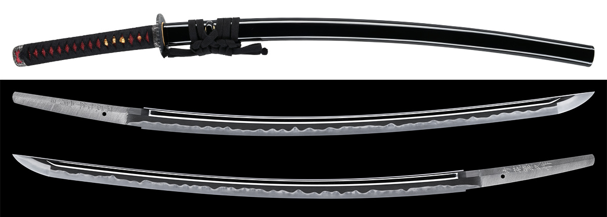 本刀体配は、刃長が二尺三寸七分、身幅元先で広く、重ね尋常、反り深く利き、中切っ先延びた豪壮な刀姿となります。表裏に棒樋を彫刻します。地鉄は、小板目肌に地沸微塵に厚く付き、精良な鍛です。焼刃は、丁子乱れを主として互の目交じり、刃中には金線、金筋長く掛かって盛んに働きます。帽子は、そのまま浅く乱れて先尖って返ります。一貫斎繁久刀匠、平成七年(1995)の一作。迫力のある力強い体躯に、地刃よく冴えた抜群の出来栄えを呈す同工傑出の御刀としてご紹介いたします。金着二重はばき、黒蝋色塗鞘打刀拵。