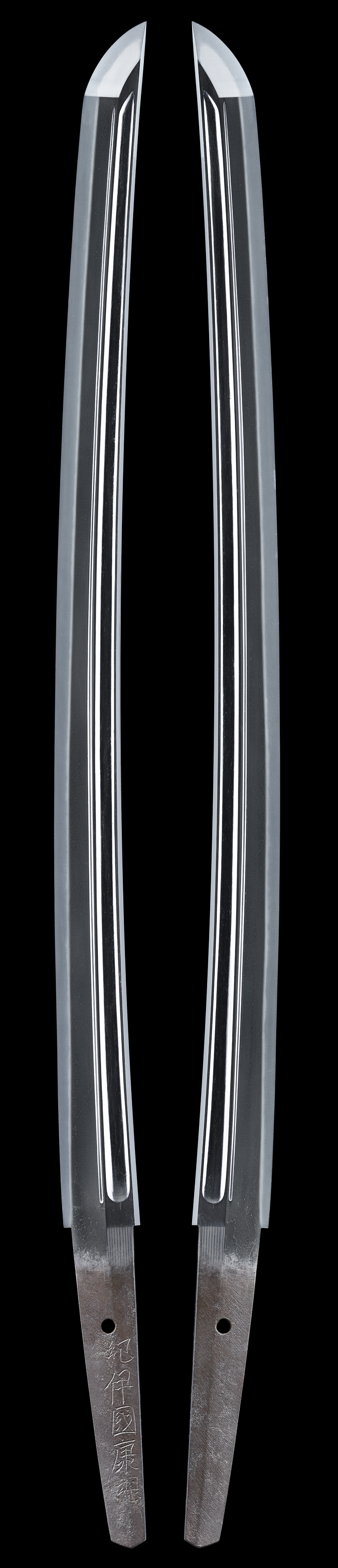 紀伊国康綱は紀州石堂派を代表する刀工で、江戸時代中期 寛文頃に活躍しました。初代備中守橘康広の門人と伝わります。紀伊国は南海道に位置する現在の和歌山県と三重県南部の一帯を指す地名ですが、大阪に住んで鍛刀した記録も残されています。紀伊国康綱、紀伊国康綱作、紀伊国橘康綱などと銘を切ります。備中守橘康広の作風に似た互の目乱れ、丁子乱れ等を得意とする非常に上手な刀工です。