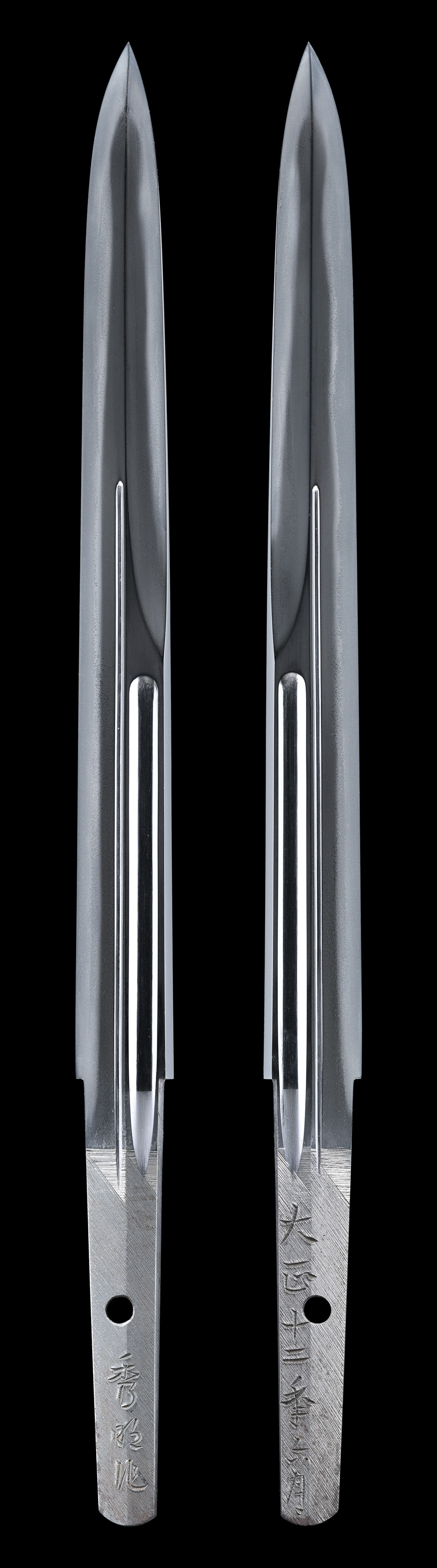 秀明(堀井俊秀)は、明治十九年(1886)、滋賀県下坂元で徳田広吉の三男として生まれ、幼名を兼吉といい、堀井家の遠縁にあたります。明治三十四年(1901)、堀井胤吉の弟子で農具鍛冶の松田胤勝に入門します。明治三十七年(1904)には、高輪の三宮男爵邸内の堀井胤明門人となり、「兼明」と改名します。翌明治三十八年(1905)には、三宮男爵が逝去され、同地の鍛刀所を引き払い、胤明と親交のあった桜井正次を頼って、師と共に鎌倉瑞泉寺鍛刀所に移りました。堀井家初代当主 胤吉は、月山貞吉、大慶直胤の両名の弟子であって、どちらも水心子正秀の弟子でした。その流れを汲む胤明の弟子 兼明(俊秀)は、大正二年(1913)に水心子正秀の「秀」の字をもらって、「秀明」と銘を改めています。大正七年(1918)には、宮内省の日本刀技術保存、刀匠保護への呼びかけに応じる形で、堀井家当主胤明・秀明(俊秀)が招聘され、日本製鋼(現 株式会社日本製鋼所)室蘭工業所に入社、瑞泉鍛刀所が開設されます。昭和三年(1928)、秀明は、日露戦争で帝國連合艦隊の旗艦であった戦艦「三笠」の砲身の残り鉄を用い、所謂「三笠刀」の製作を始めます。昭和八年(1933)、皇太子(明仁親王)殿下が御生誕され、翌昭和九年(1934)、秀明は、刀銘に「明」の字を下に使っていることを不敬に感じ、「俊秀」と改名しています。昭和十七年(1942)、人間国宝 高橋貞次のほか同工は、満州国建国十周年記念の謝恩刀を製作しており、翌昭和十八年(1943)に没しています。
