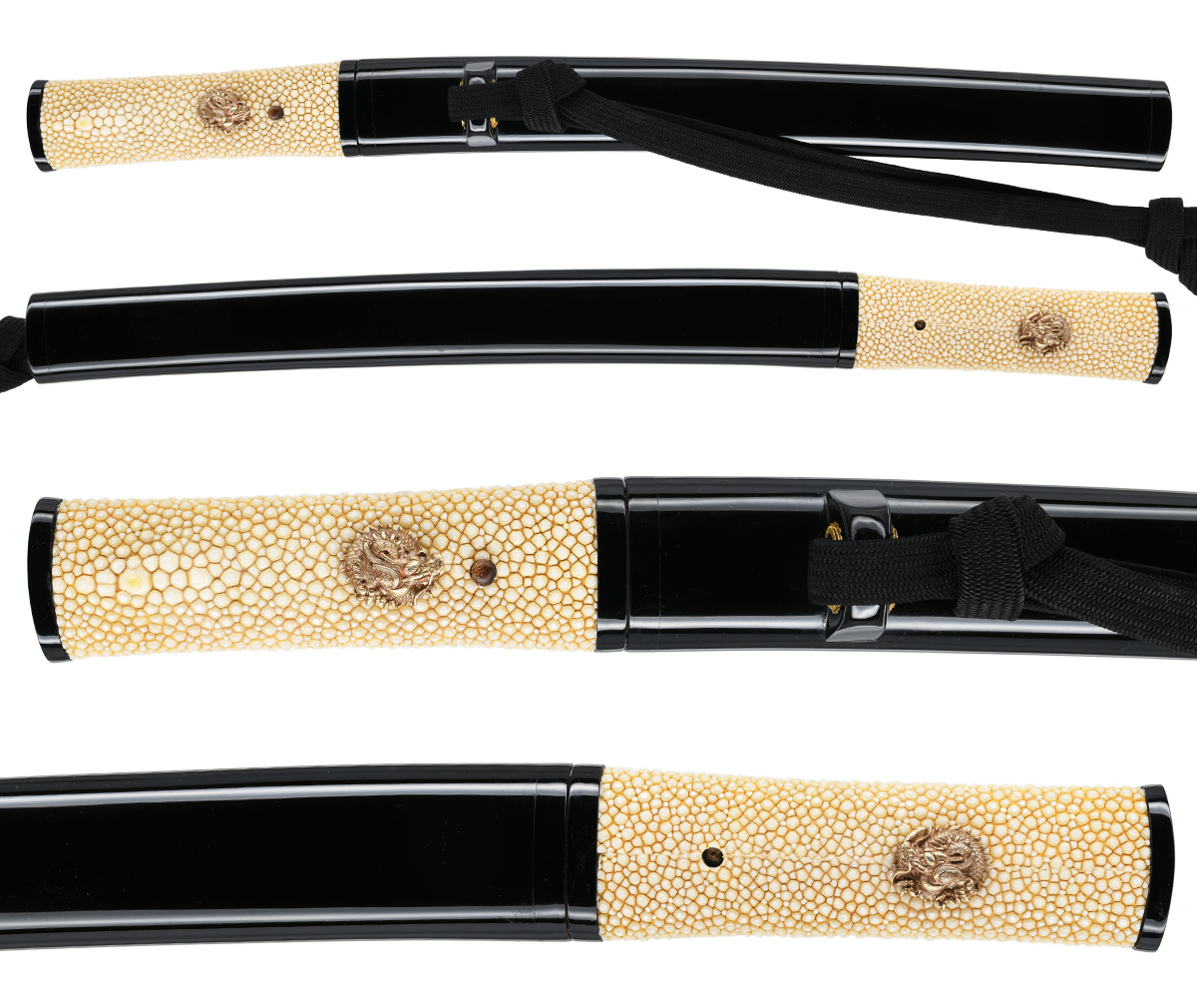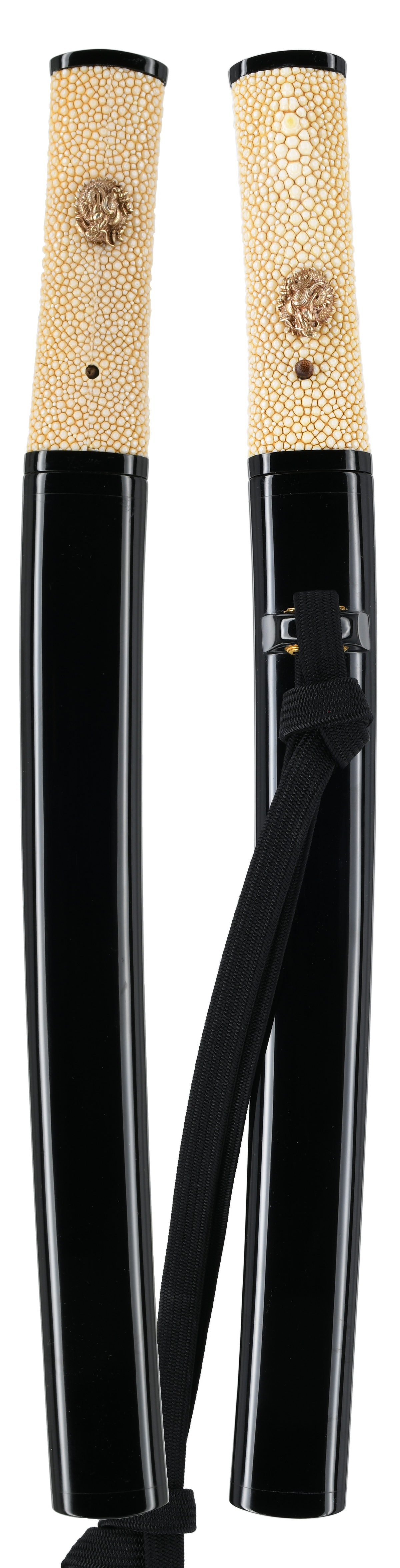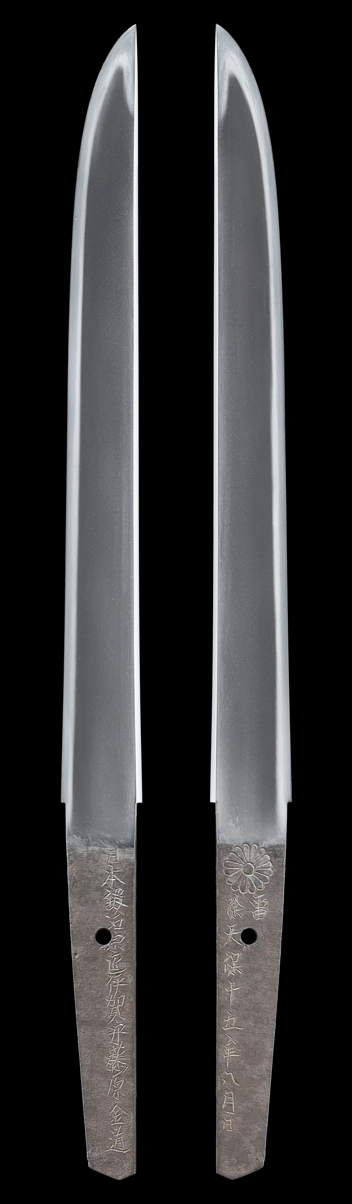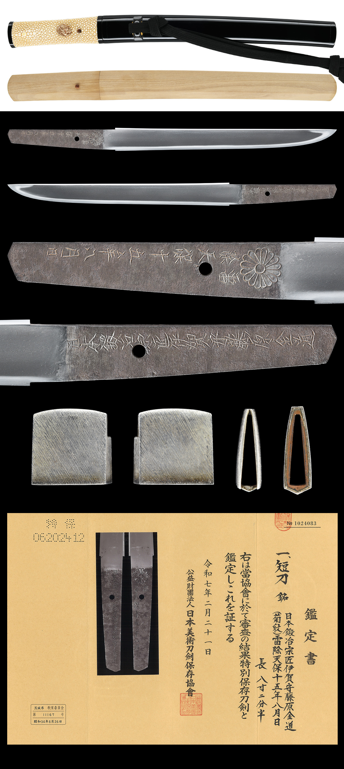 本作は、刃長が八寸二分半、身幅尋常に、重ねやや薄め、すらりとした気品のある刀姿を呈す平造姿の一口です。地鉄は、小板目肌に処々流れ肌交じり、総体綺麗に詰んで、地沸付き、細かに地景が入ります。刃文は、小沸出来の直刃が良く冴えて焼かれます。帽子はそのまま直ぐで、先小丸に返ります。茎は生ぶ、浅い勝手下がり鑢目で、刀工銘と年紀、菊紋、雷除と刻します。また菊紋の下に刻された「雷除」は、五代目より切り添えられるようになったと伝えます。本刀は、天保十五年紀の伊賀守金道の一口。黒蠟色塗の短刀拵と合わせて上品にまとまった御刀としてご紹介いたします。白鞘、銀着一重はばき、黒蠟色塗鞘合口短刀拵、特別保存刀剣鑑定書。
