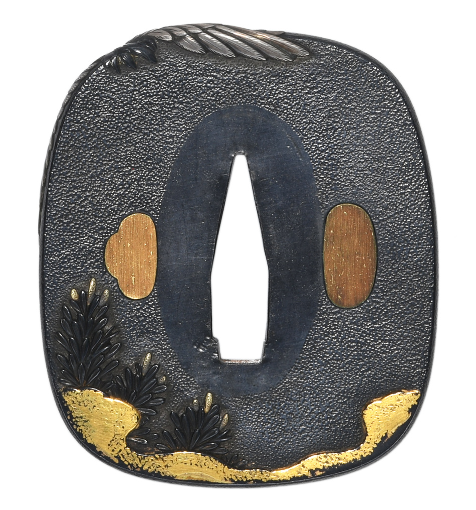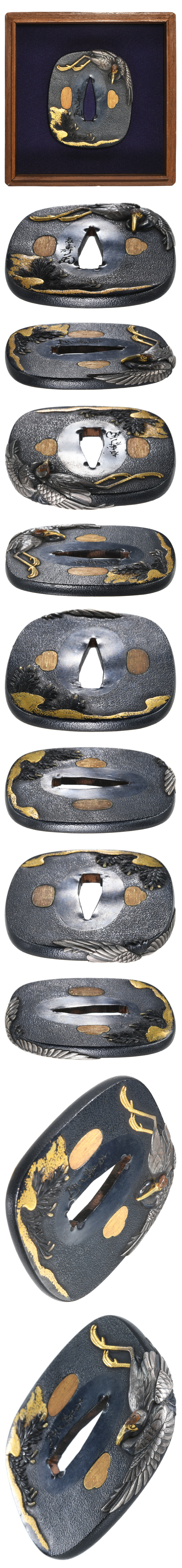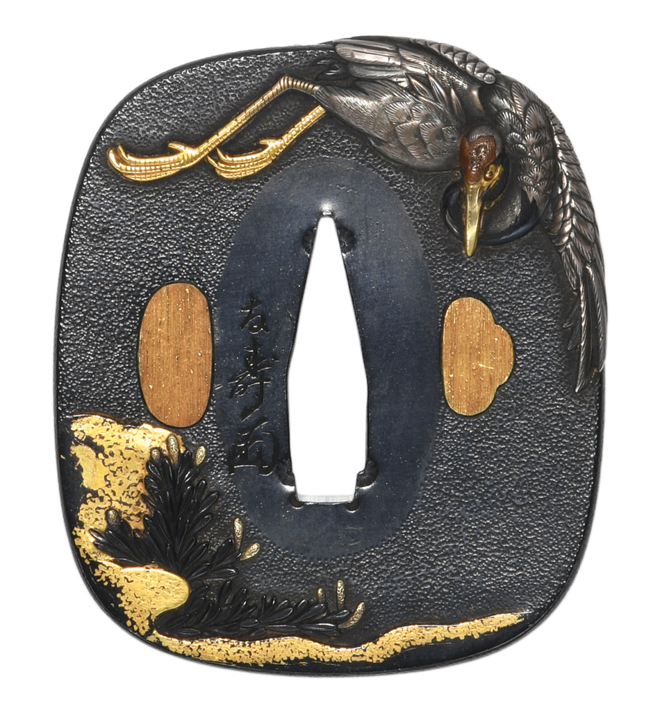 松鶴図鍔 障泥形 赤銅石目地 高彫 象嵌色絵 肉彫耳