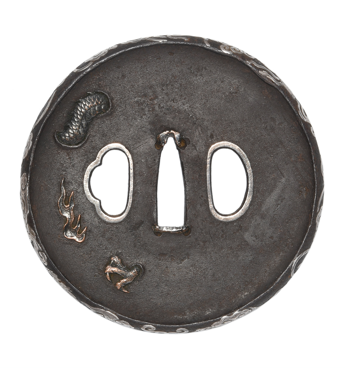 丸形 鉄磨地 鋤出高彫 象嵌色絵 象嵌桶底耳