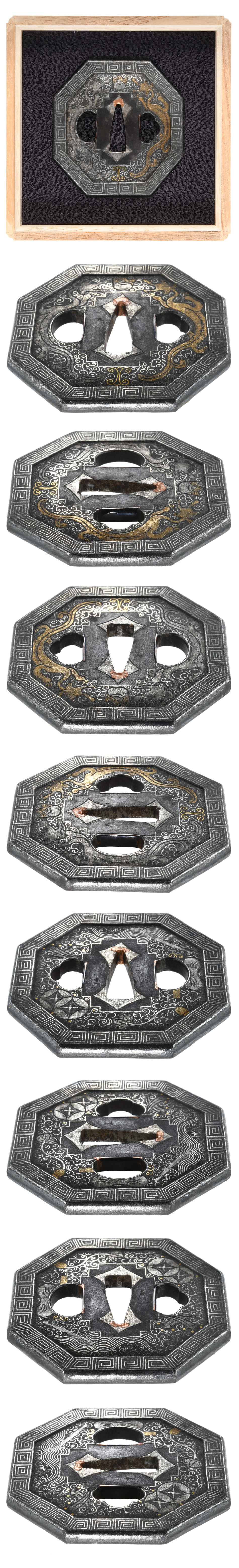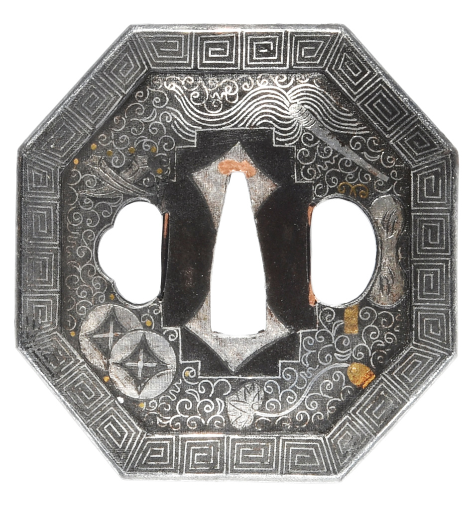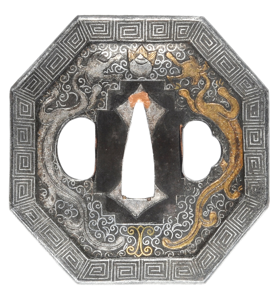 珠追双龍唐草図鍔 八角形 鉄地 象嵌 鋤残土手耳