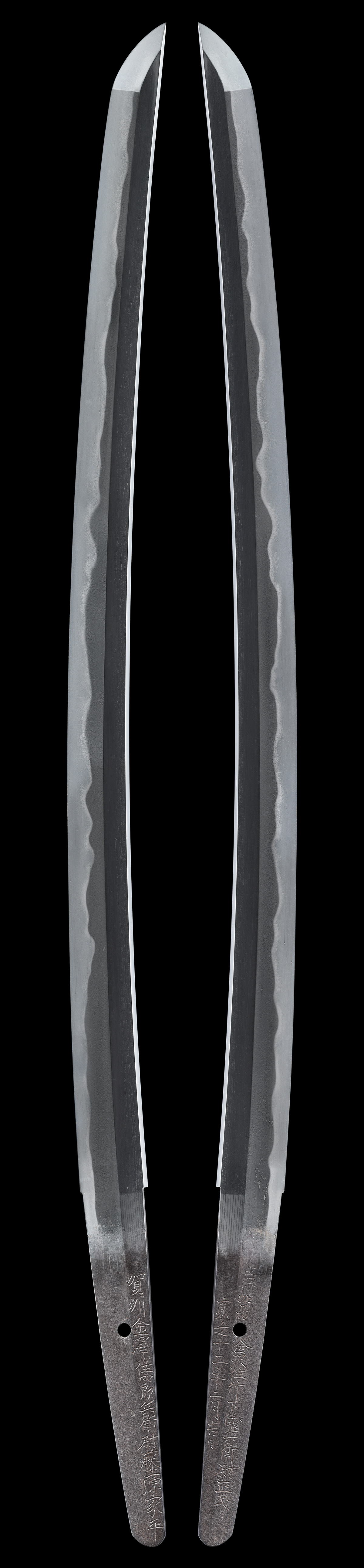陀羅尼一派は、加賀国橋爪に住した家次や家永等の刀工含む「橋爪派」を源流にすると伝えます。陀羅尼一派にあっては、主な刀工として橘勝国、家平、家忠、吉家などが活躍しています。本品は、初代家平(四郎兵衛尉家平)、竹下儀兵衛尉正氏との合作の御刀。初代家平は、初代家忠の次男で、性を洲崎、斬れ味に優れ、業物に列せられます。正氏は、江戸中期 寛文頃に活動した同国出身の刀工であります。家平は、同時期の加賀刀工である賀州兼若、藤原家忠や清光などと共に代々前田家を支えた名工として知られます。