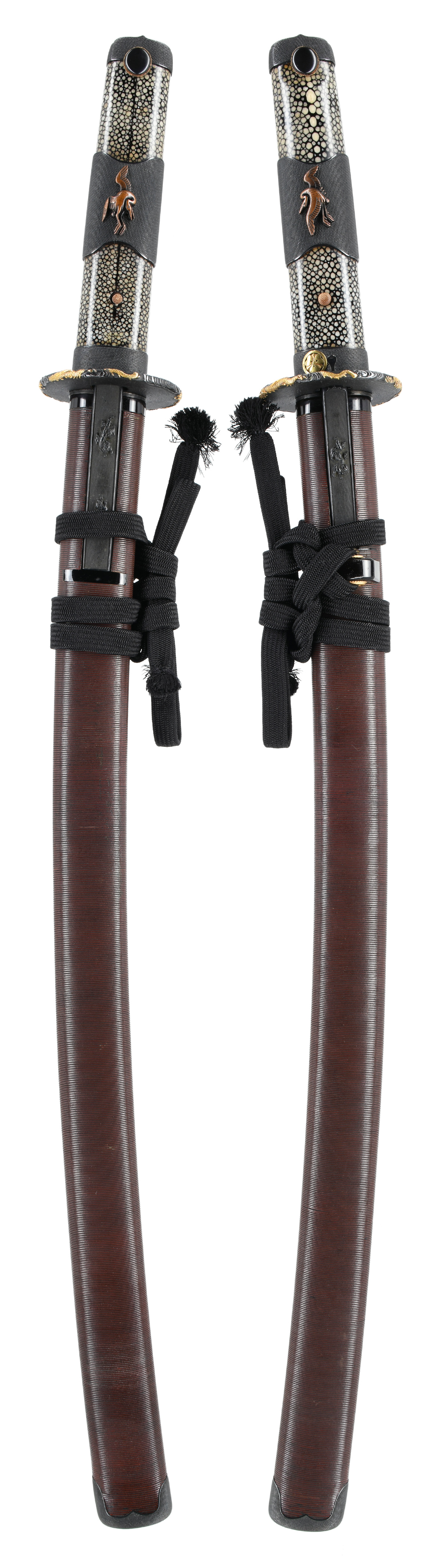 本刀体配は、刃長が一尺七寸強、身幅重ね尋常、反りやや浅めで中切っ先となります。鍛は、小板目肌に地沸微塵に厚く付き、頑強な地肌を呈します。焼刃は湾れを主調に互の目、丁子交じり、処々こずんで箱がかる感があり、刃沸よく付き、匂口明るく冴えます。帽子は、焼き深く、一枚風となって返ります。茎は生ぶ、筋違鑢で、刀工銘と年紀を刻します。拵は、赤銅金具を配し、柄が研出鮫、鞘が千段刻みとなるなど、時間をかけて丹念に製作されたことが伺える逸品が附いております。本作は加賀国(石川県)、陀羅尼派の初代家平(四郎兵衛尉家平)、同国正氏との合作の一口。力強い地鉄に、湾れ基調の刃を焼き、同一派の特徴現れた貴重な優刀です。白鞘、金着二重はばき、朱漆塗千段刻鞘脇差拵、特別保存刀剣鑑定書。