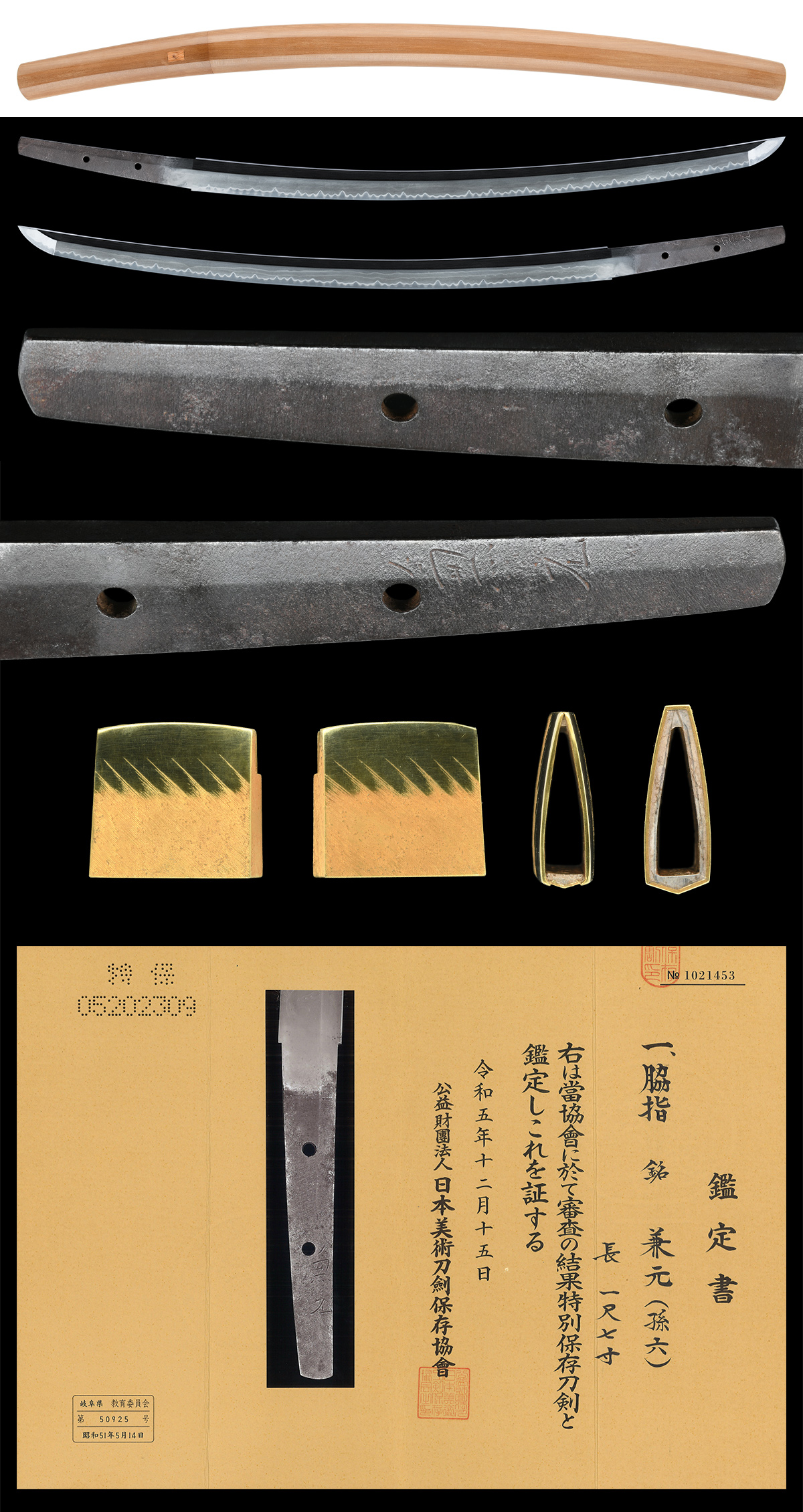 本作体配は刃長が一尺七寸、身幅尋常、重ね確りとし、反りよく利いて中切っ先となる刀姿を呈します。地鉄は板目肌が良く練れて、流れごころ交じり、地沸付き、映りが明瞭に立ちます。焼刃は同工独自の三本杉刃文が焼かれ、崩れることなく抜群の出来栄えとなります。孫六兼元の刃は後代に比べ、完全な三本杉にはならないと語られますが、本作は互の目尖り刃が整然と綺麗に並んで、三本杉刃を構成しています。帽子は乱れ込み先丸く返ります。茎は磨上げながら鉄味よく残り、二字で銘が切られます。本刀は初代孫六兼元、二字在銘の貴重な脇差です。本工独自の三本杉刃文が破綻なく焼かれた同工の傑作としてご紹介いたします。白鞘、金着一重はばき、特別保存刀剣鑑定書。