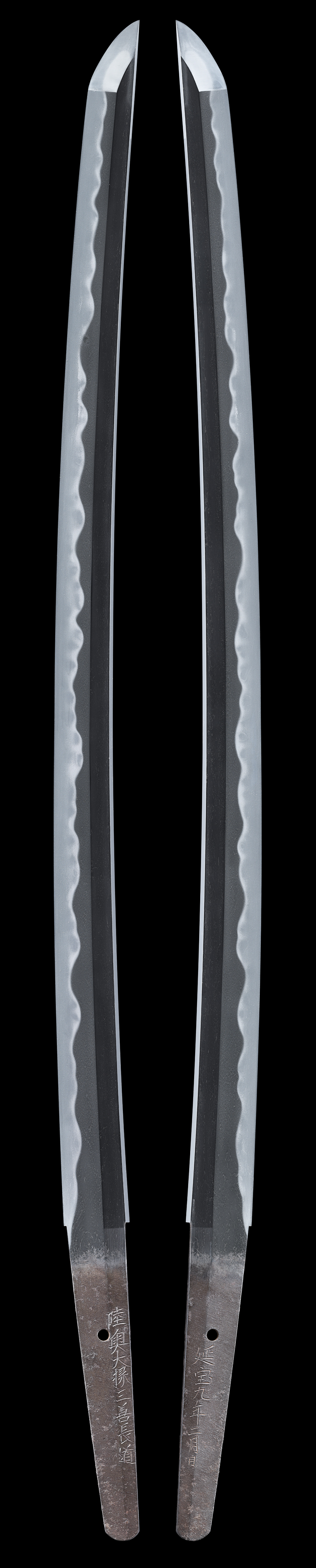 会津の三善一族は長国を祖とし、その子政長から長道へと代々続く陸奥刀匠の名家です。上京し肥前忠吉と同じく埋忠明寿に学んだ為に山城伝の趣強く、寛永四年(1627年)より父長国と共に会津で鍛刀。美濃から移住してきた兼定一派と双璧の三善家はこのときより始まります。政長の子三善長道は、寛永十年(1633年)会津生まれです。会津正宗、会津虎徹とも称され、出来は虎徹にやや類似し、斬れ味の良さは後代まで引き継がれています。長道系は十代(明治)まで会津鍛冶の棟梁としての地位を保っています。同工長道は寛文・延宝期、初代の作で、名は藤四郎、叔父長俊に師事しました。はじめ道長と銘を切り、万治二年に陸奥大掾を受領後、三善長道と改めます。津田助廣の弟子という説もあります。作品は奥州一の名工と称されるに申し分なく、新刀上作、最上大業物に列します。刀銘は、陸奥大掾藤原長道三善藤四郎、長道、陸奥大掾三善長道、三善陸奥守藤原長道藤四郎、などと銘切ります。寛永十年(1633年)会津生まれ、貞享二年十一月十七日(1685年)没。