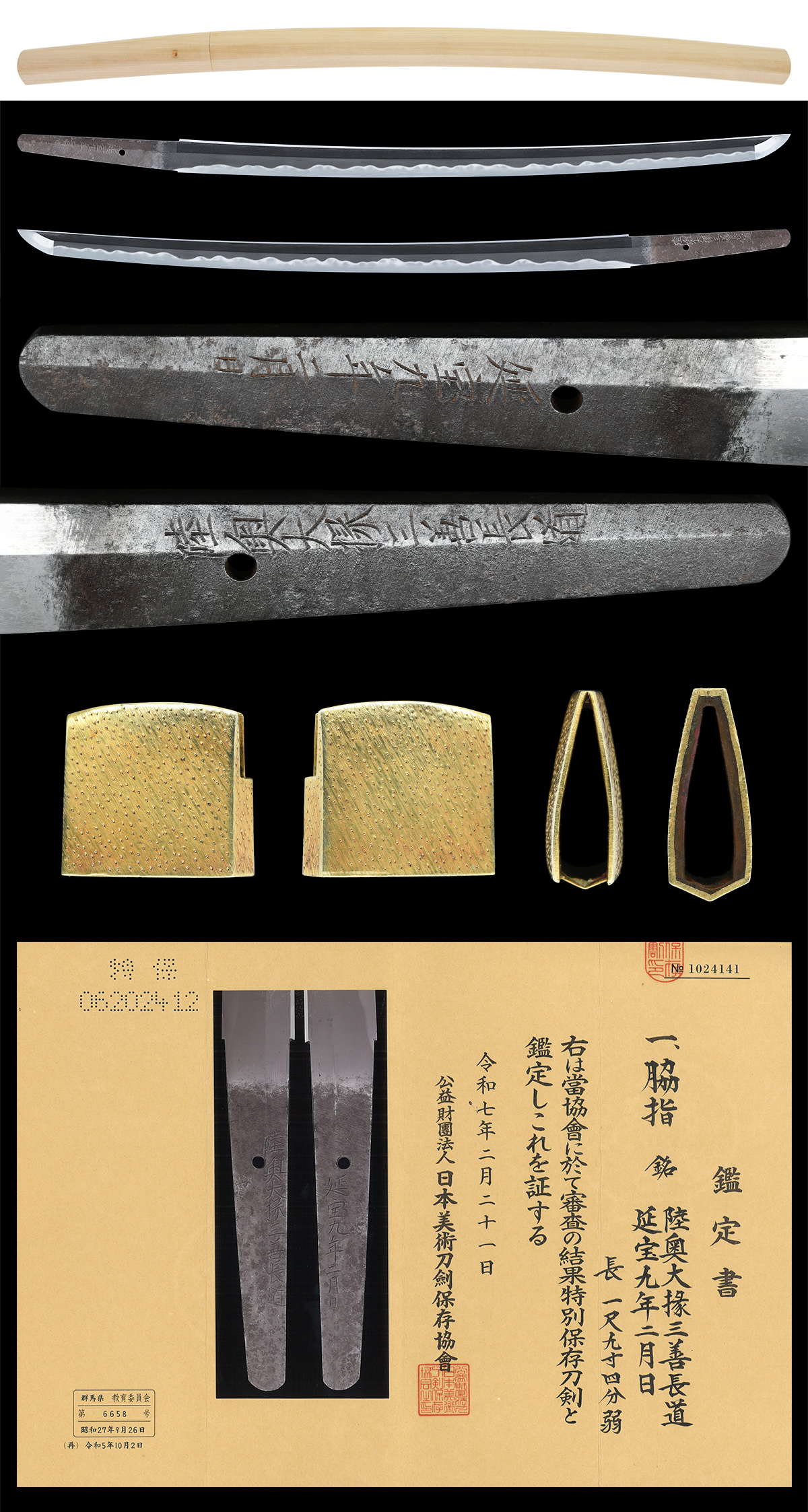 本作体配は、刃長が一尺九寸四分弱と、刀に迫る長脇差で、身幅広く、重ね尋常、反り適度で中切っ先となる健全な刀姿の一口です。地鉄はよく練れた精良な小板目肌鍛に、地沸が微塵に付き、細かく地景が入る精緻な鍛となります。刃文は、互の目を主として丁子、尖り刃、湾れ交じり、処々腰開いて高低がつき、刃縁に小沸がふんわりと付いて匂口明るく冴えます。帽子は直ぐとなり、先小丸に返ります。茎は生ぶ、筋違鑢目で刀工銘と年紀を刻します。新刀期、会津を代表する名工 初代三善長道、延宝九年の御刀。小板目肌精緻で潤い、沸匂深く、明るく冴えた見事な刃を示す同工の貴重な優品です。白鞘、金着一重はばき、特別保存刀剣鑑定書。