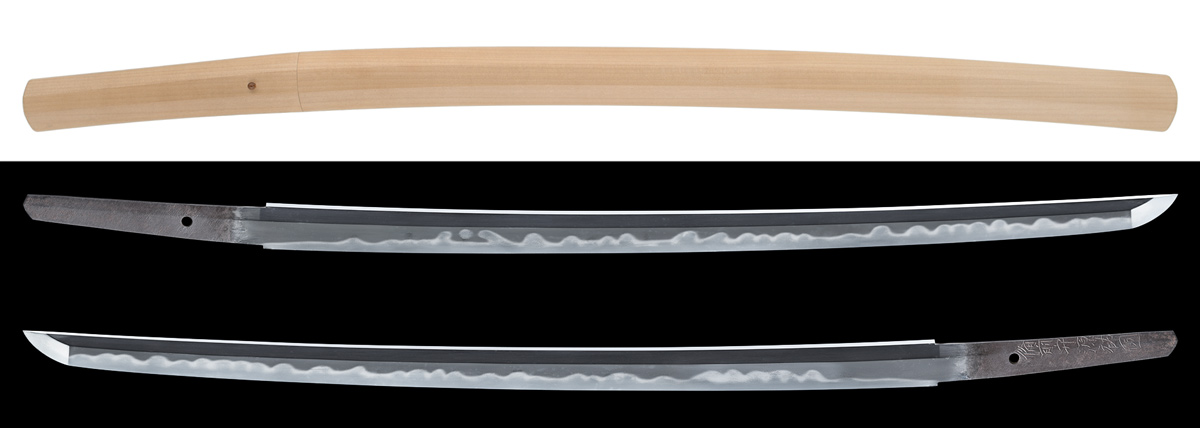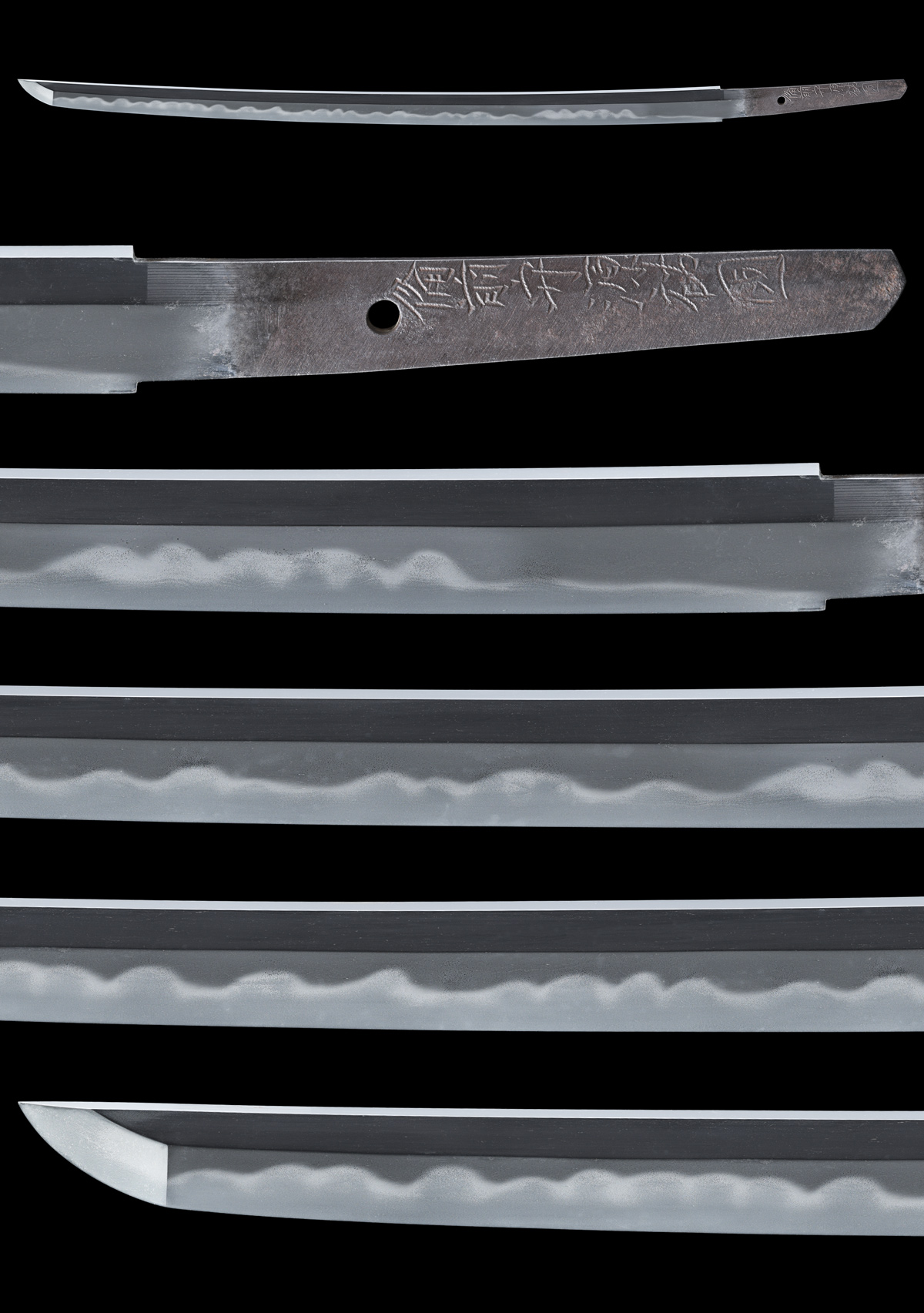 地鉄は小板目肌で地沸が付き、破綻なく総体綺麗に詰んで、精良な肌合いを呈します。焼刃は直ぐで焼出し、互の目丁子乱れとなります。処々湾れや尖り刃などを交え、一部逆がかり、飛び焼き掛かり、動きのある派手やかな刃で、刃縁に小沸が良く付いて、匂口極めて良く冴えます。帽子は直ぐとなり、先小丸に返ります。茎は化粧筋違鑢を施し、刀工銘を刻します。