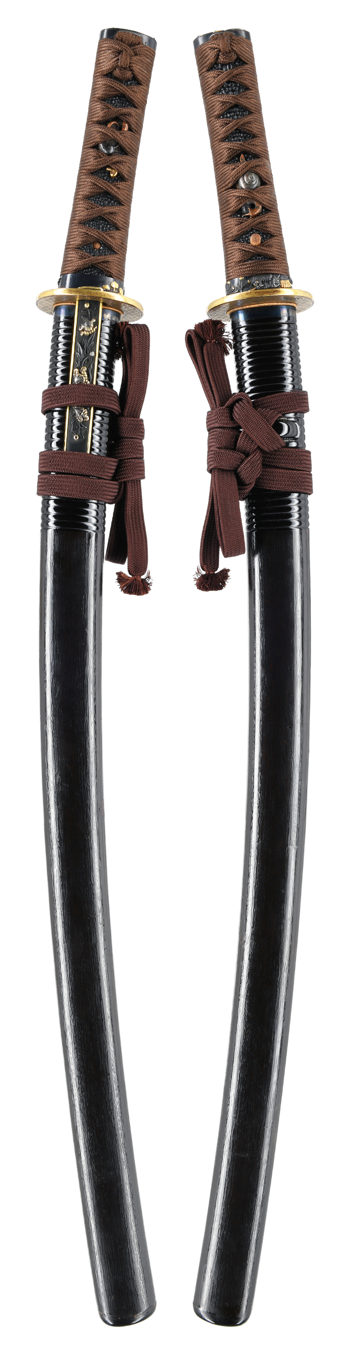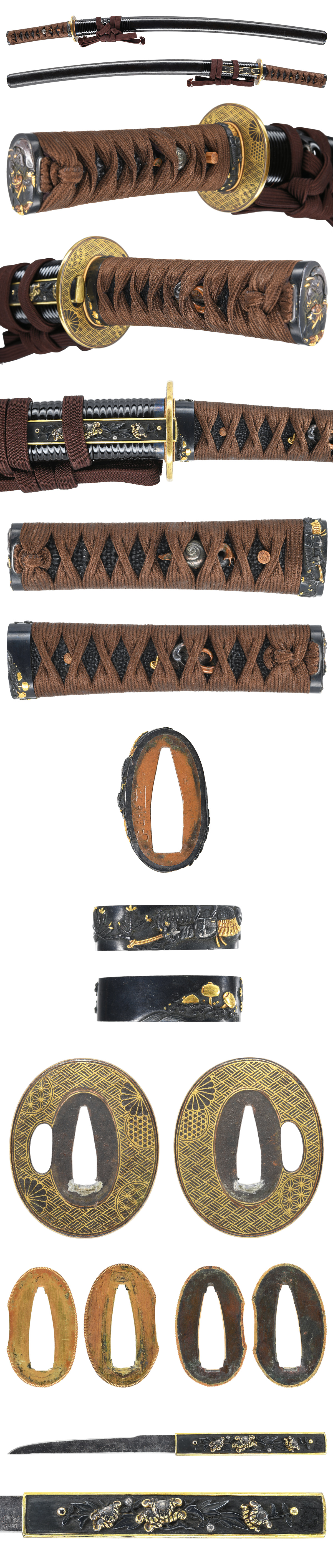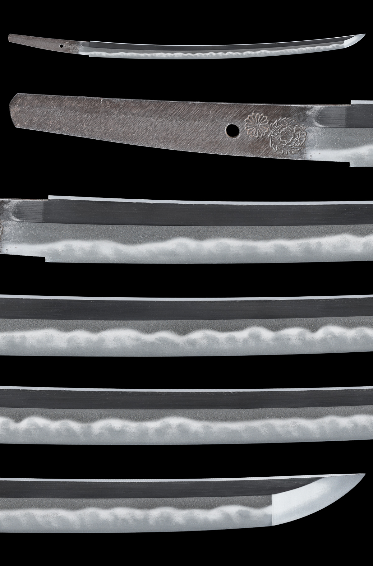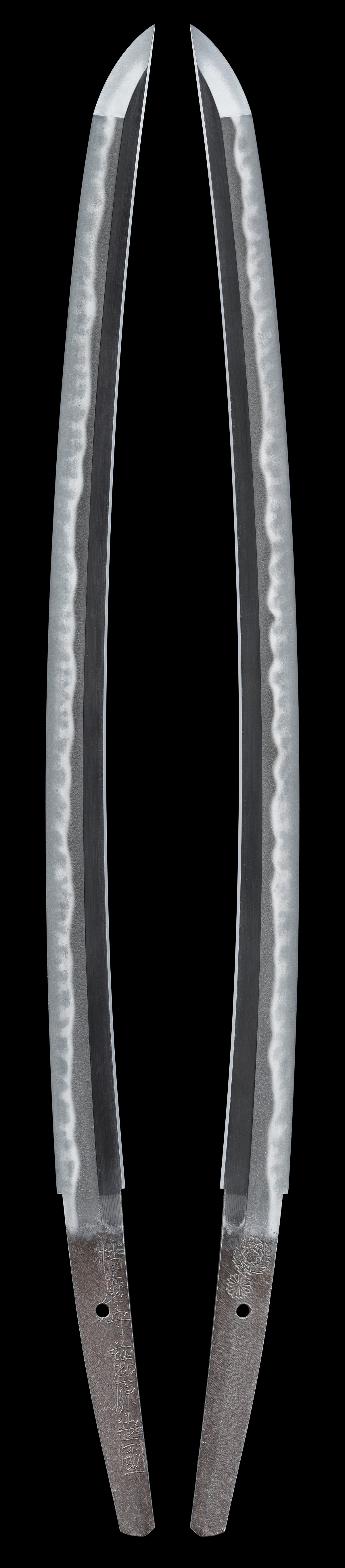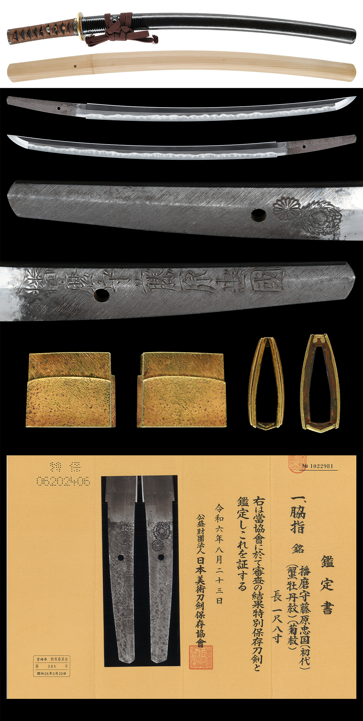 本作体配は、刃長が一尺八寸、身幅広く元先で確りとし、反り適度、平肉豊か、中切っ先延び、ずしりと重さを感じる鋭利で力強い姿の一刀。鍛は良く練れた小板目肌に地沸付き、地景が密に入り、破綻なく綺麗な肌です。焼刃は丁子を主調に、互の目、角張った刃、矢筈刃等を交え、高低つき、刃縁に小沸ふんわりと付いて、匂口明るく冴えます。帽子は勢いを落として、直ぐとなり、先小丸に返ります。茎は生ぶ、筋違鑢目、差表に刀工銘、裏に蟹牡丹紋と菊紋を切ります。本刀は初代忠國の晩年作とみられる上々の一作で、潤いあふれる緻密な肌に、丁子乱れを焼く拵付の逸品です。白鞘、金着二重はばき、腰刻黒漆変塗鞘脇差拵、特別保存刀剣鑑定書。