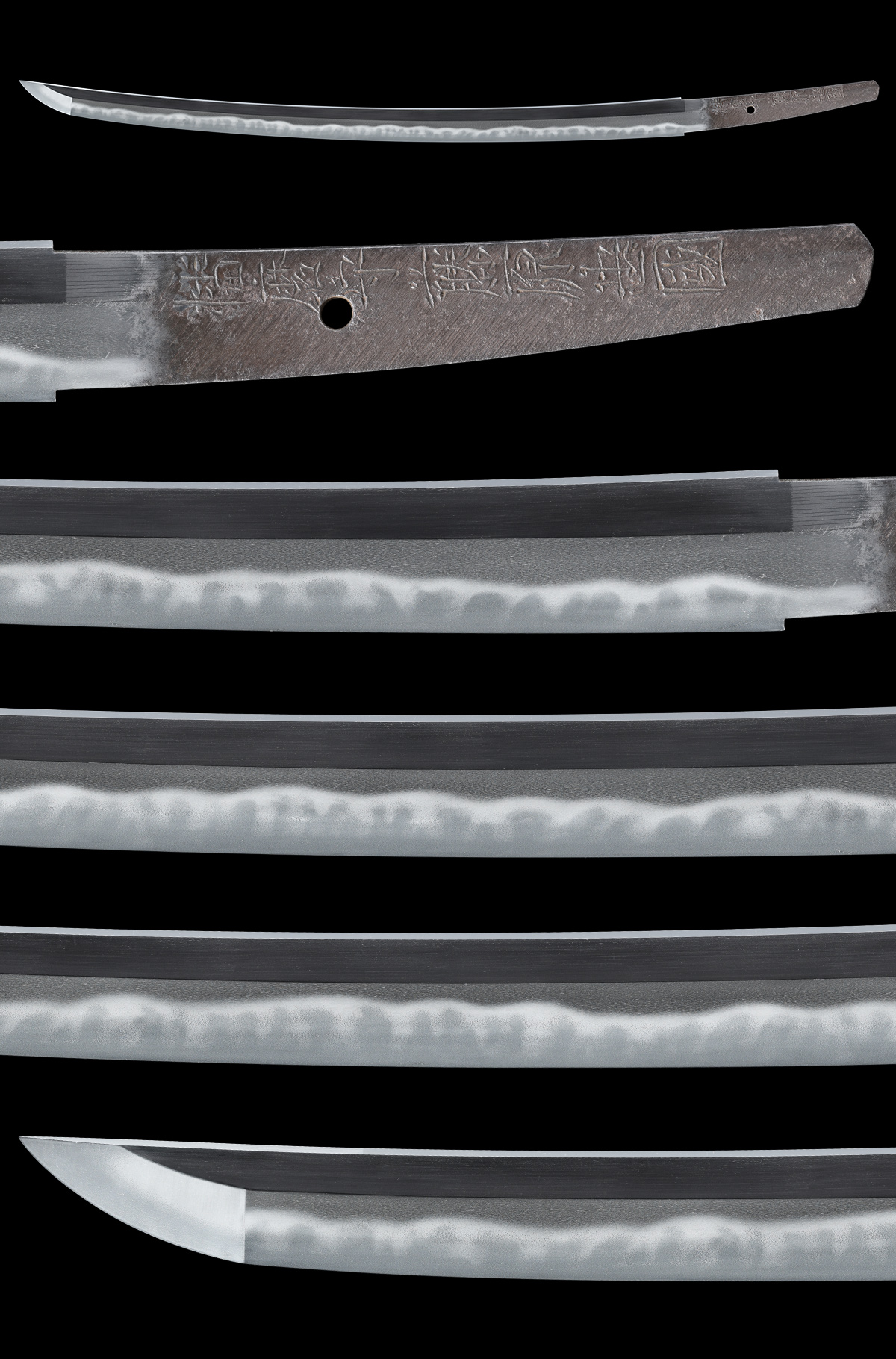 初代播磨守藤原忠国、本工の忠国は、初代忠吉の弟である広貞(吉家)の子で、名は橋本六郎左衛門。初銘は広則といいます。寛永十一年(1634)に播磨大掾を受領し、忠国と改銘します。後年、播磨守に転じます。はじめ播磨大掾の磨を摩と刻銘し、寛永ころから寛文にかけて作品が残されています。晩年は播磨入道休鉄と称しました。刻銘には、「播磨大掾藤原忠国」、「肥前住播磨大掾藤原忠国」、「肥前国住播磨守忠国」、「肥前住播磨入道藤原休鉄等」等があります。彼は肥前国の脇肥前と呼称される一派の中でも特に抜きん出た存在であり、虻の目と云われる独特の互の目刃を焼くことで有名な刀工です。
